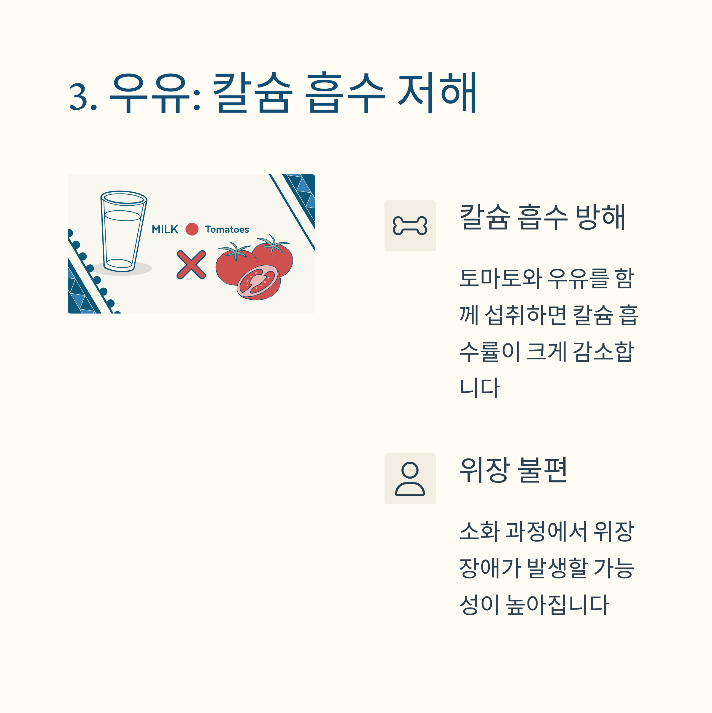 | 토마토 + 우유 | 칼슘 흡수 저하, 위장 장애, 칼슘산 형성 |