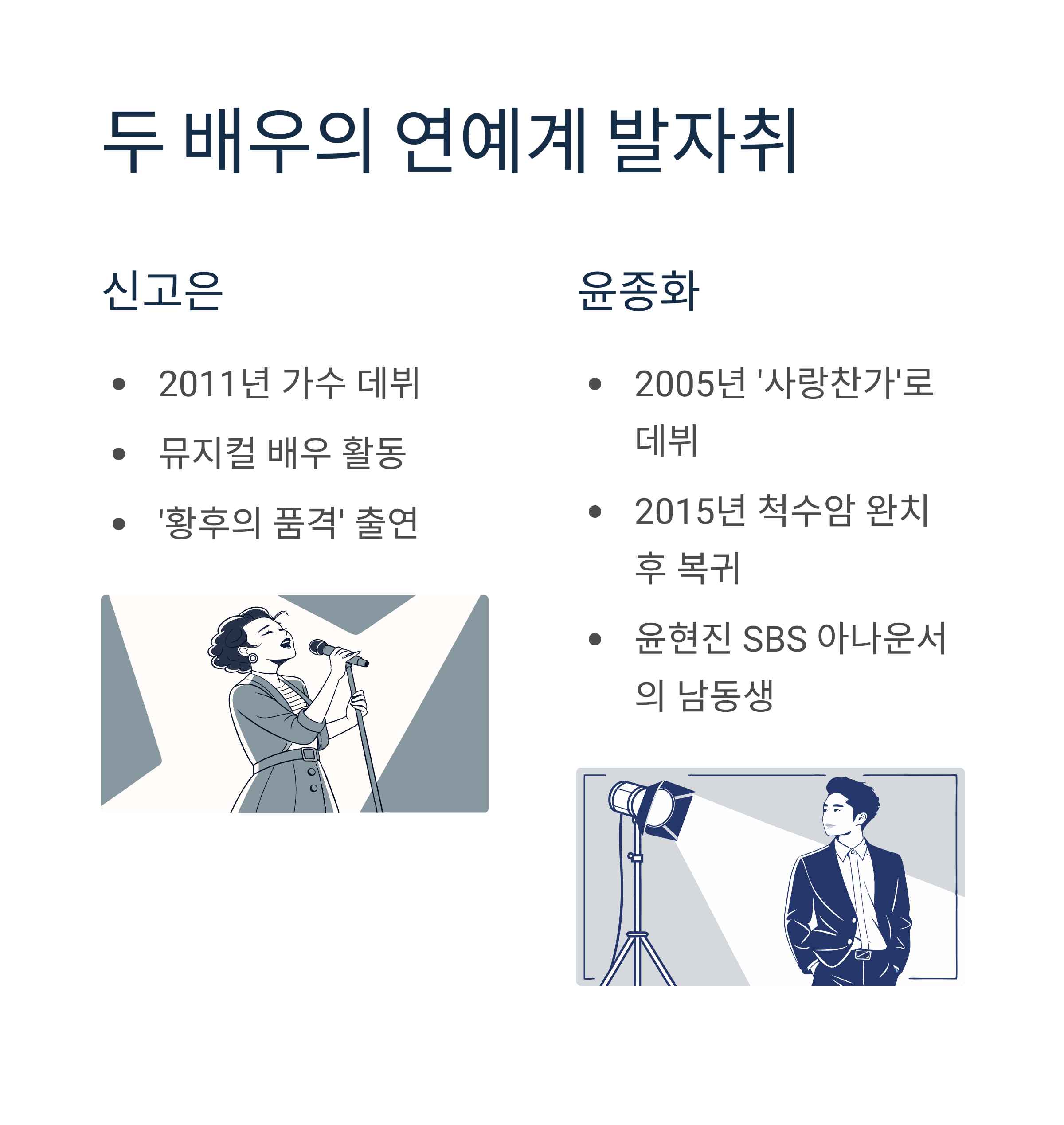 신고은은 뮤지컬과 드라마에서 활약하며 2011년 가수로 데뷔한 후 연기자로 입지를 다졌고, 윤종화는 2005년 드라마로 데뷔한 후 꾸준히 활동을 이어왔습니다. 윤종화는 과거 척수암 투병을 극복하고 복귀한 경력도 있어, 팬들에게 더욱 강한 인상을 남긴 배우입니다. 두 사람 모두 각자의 자리에서 새로운 인생을 시작할 준비를 하고 있습니다.
