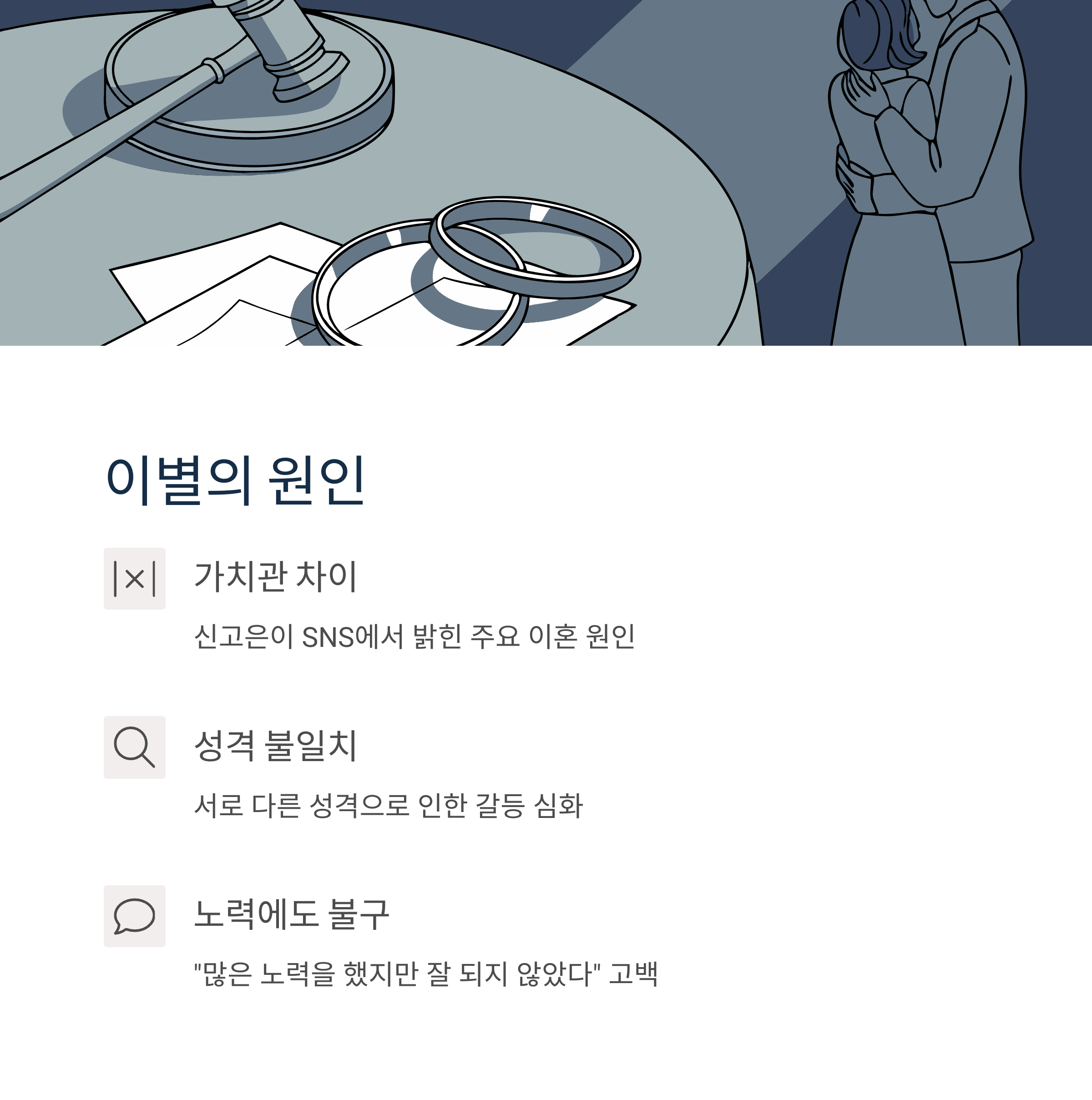 | 파경 사유 | 가치관·성격 차이로 인한 조율 실패 |