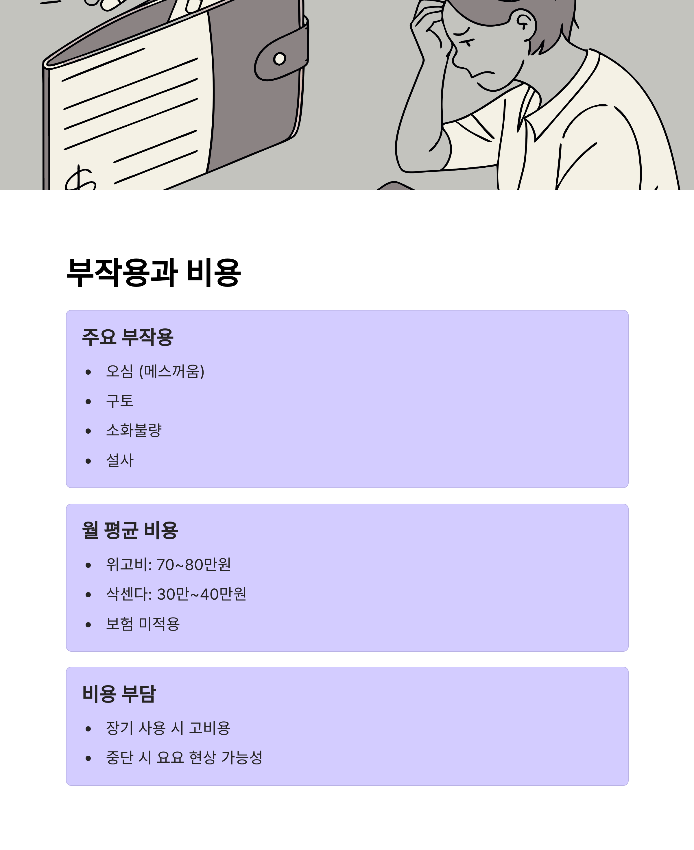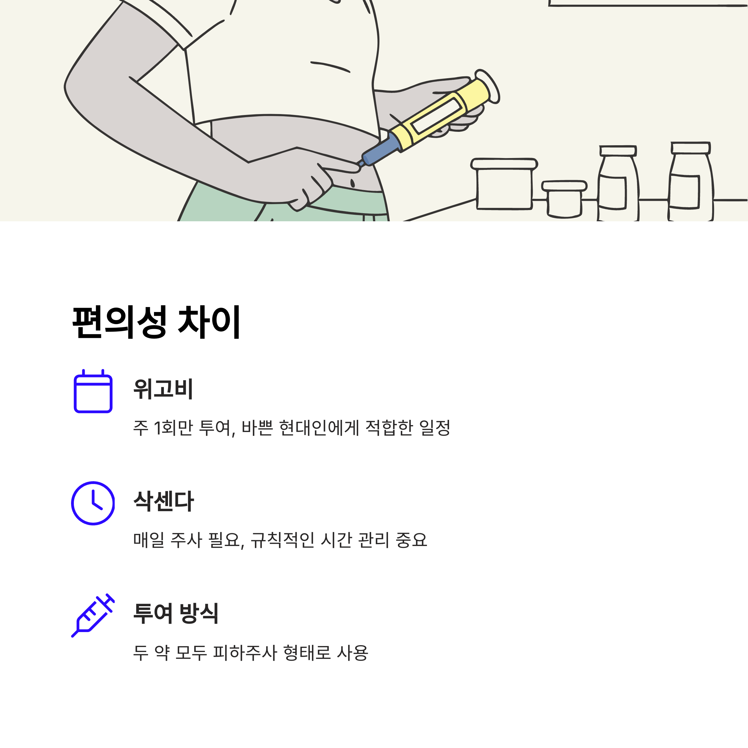 | 간질환 개선 효과가 일부 확인된 바 있습니다. | 오랜 임상 경험과 안정성이 장점입니다. | 임상 결과: 위고비 15%, 삭센다 7.5% 감량 |