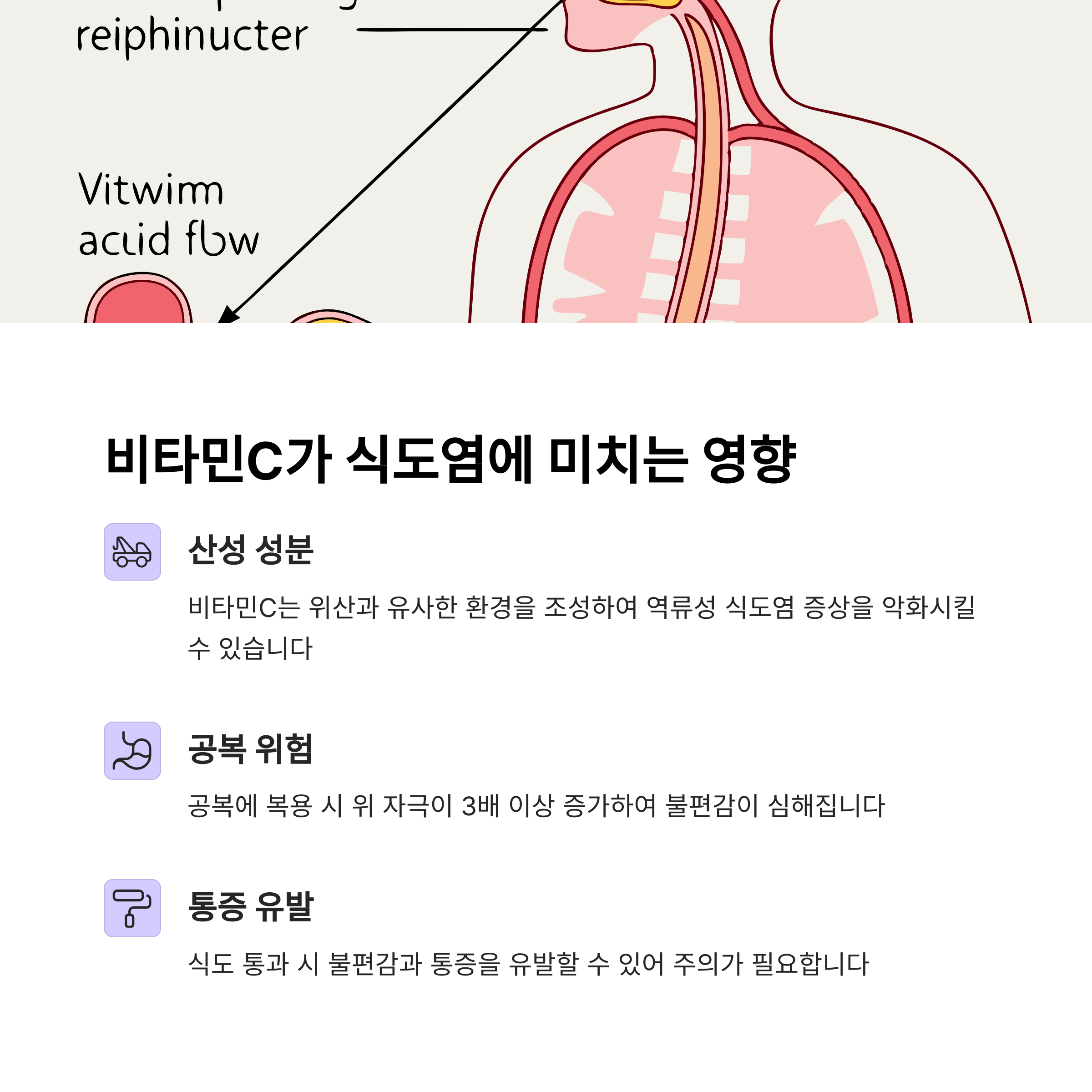 | 산성 비타민C 주의 | 위산 분비를 자극해 역류성 식도염을 악화할 수 있음 |
