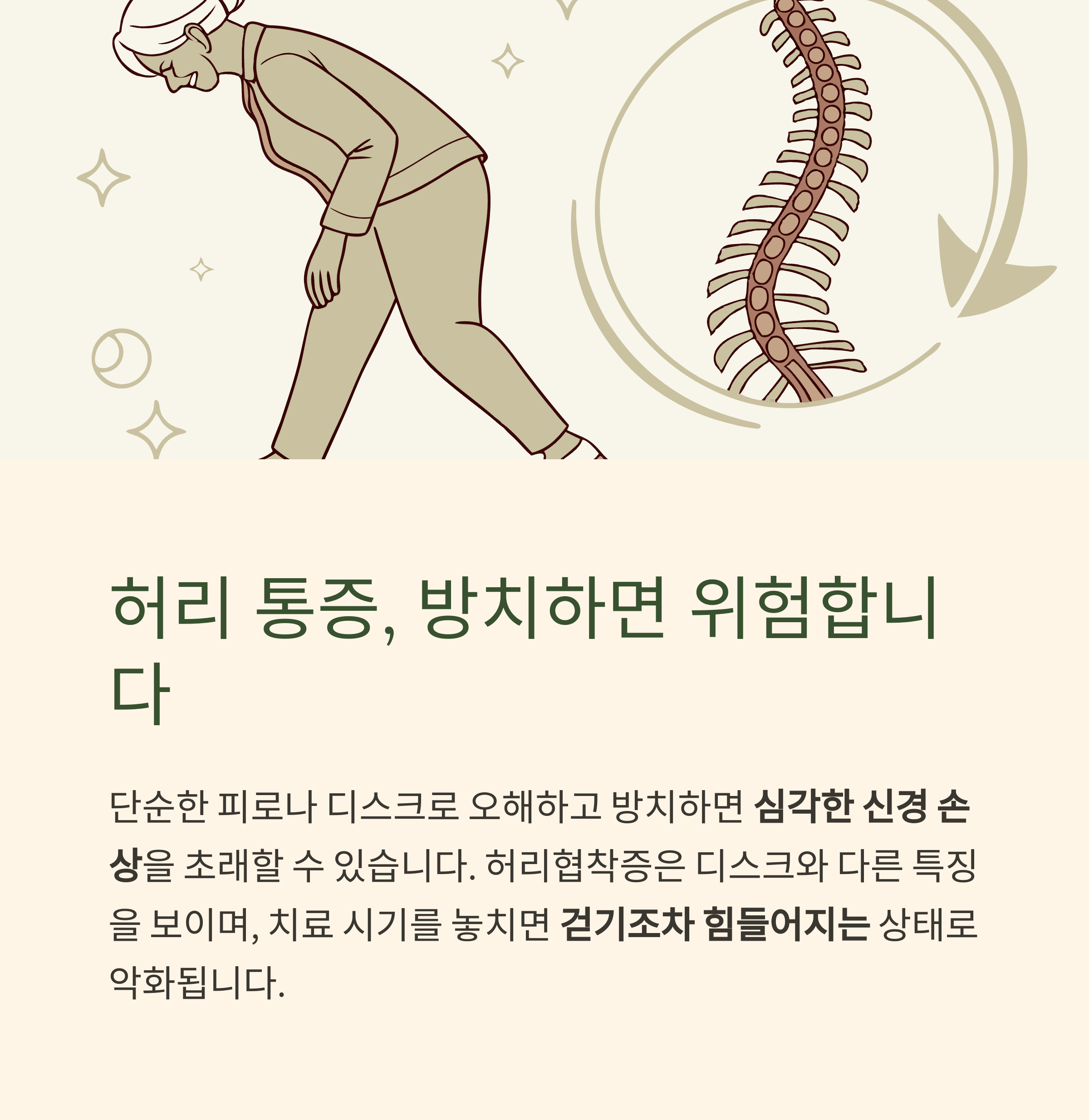 허리협착증을 단순 요통으로 여기고 방치하면, 신경 압박이 만성화되며 영구적인 신경 손상으로 이어질 수 있습니다.