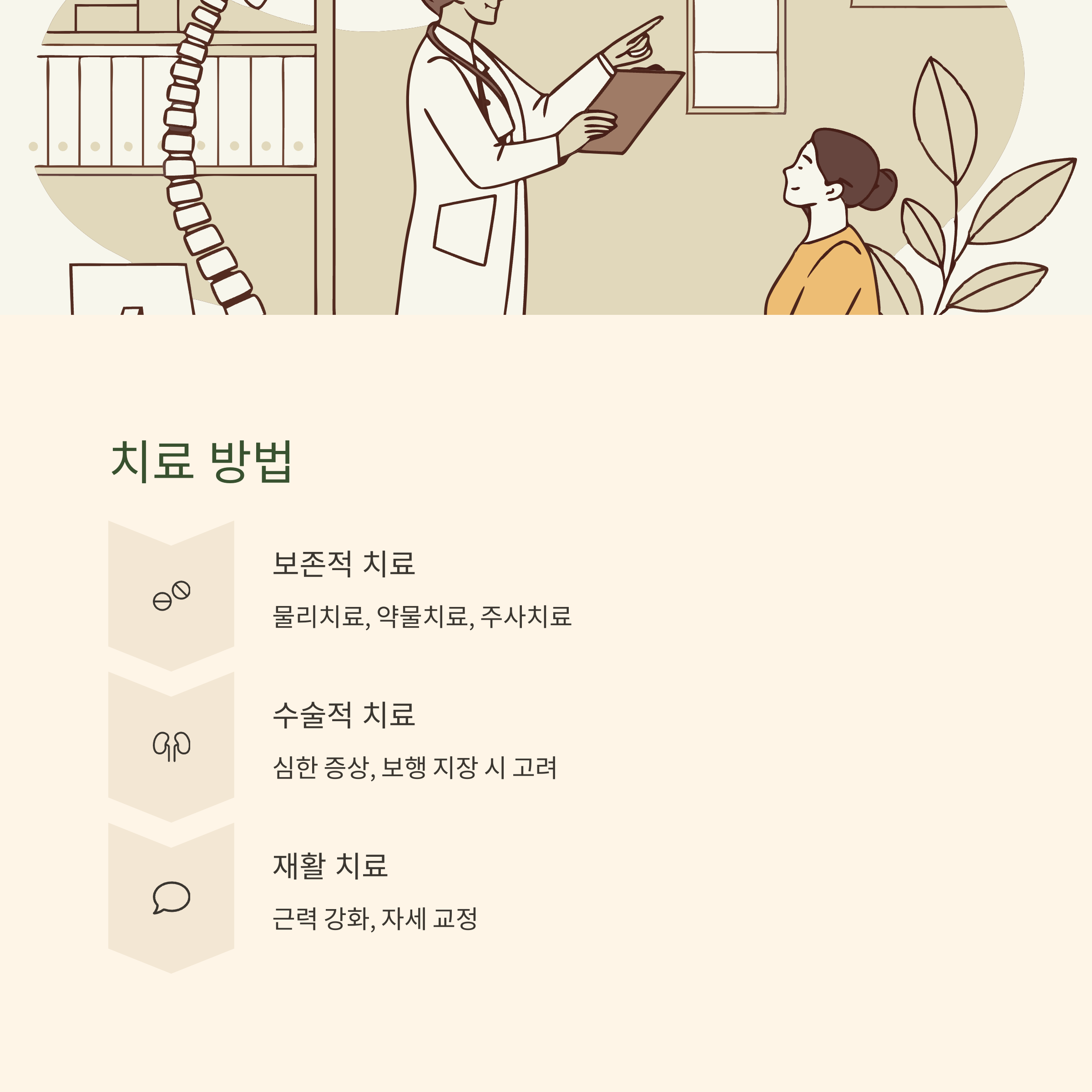 물리치료, 약물치료, 주사치료 등을 통해 염증과 신경 압박을 줄이는 방식이 일반적입니다.