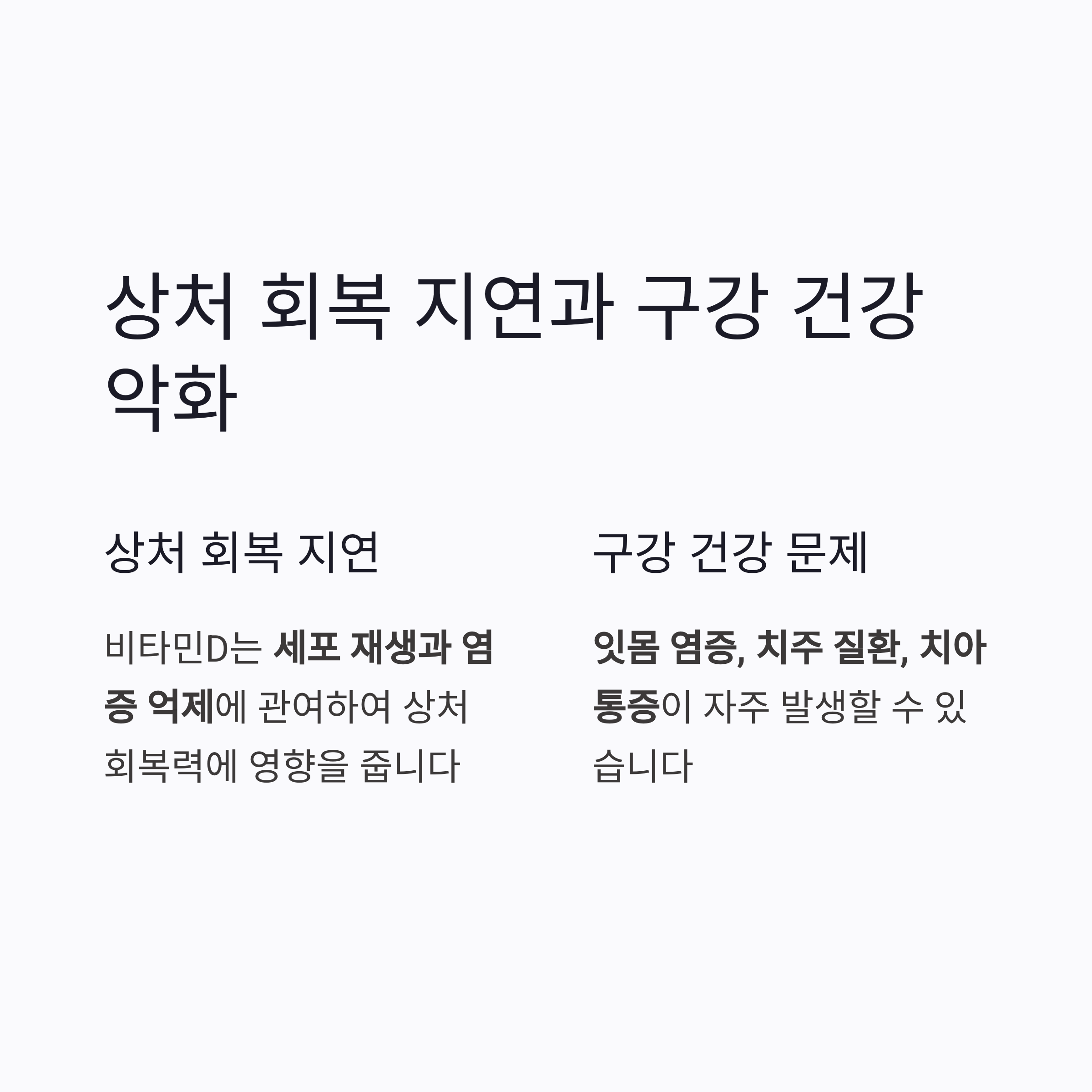 치아와 잇몸은 뼈의 연장이기 때문에 비타민D가 부족하면 잇몸 염증, 치주 질환, 치아 통증이 나타날 수 있습니다.