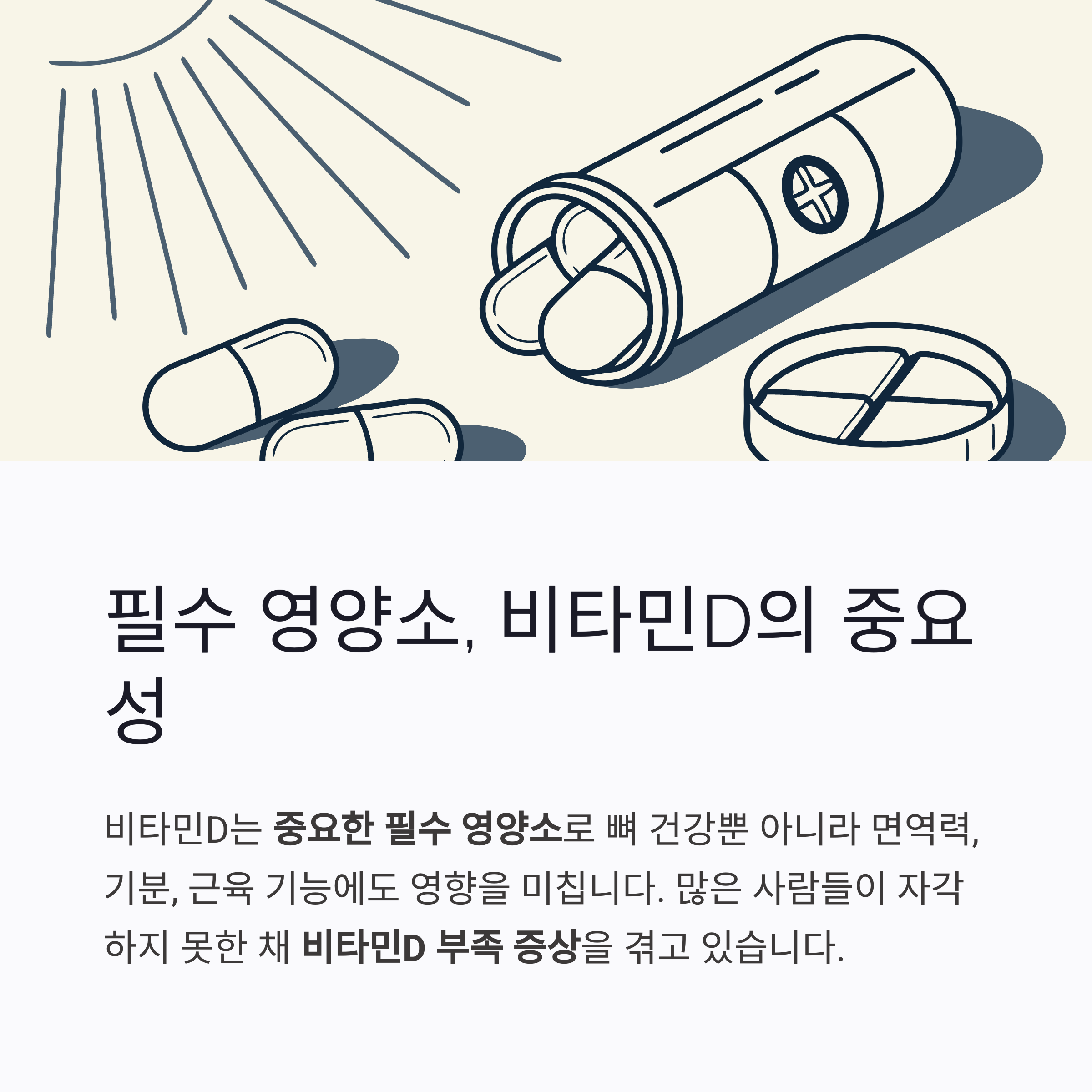 비타민D는 뼈 건강을 넘어 면역력, 기분, 근육 기능에까지 영향을 미치는 중요한 필수 영양소입니다.