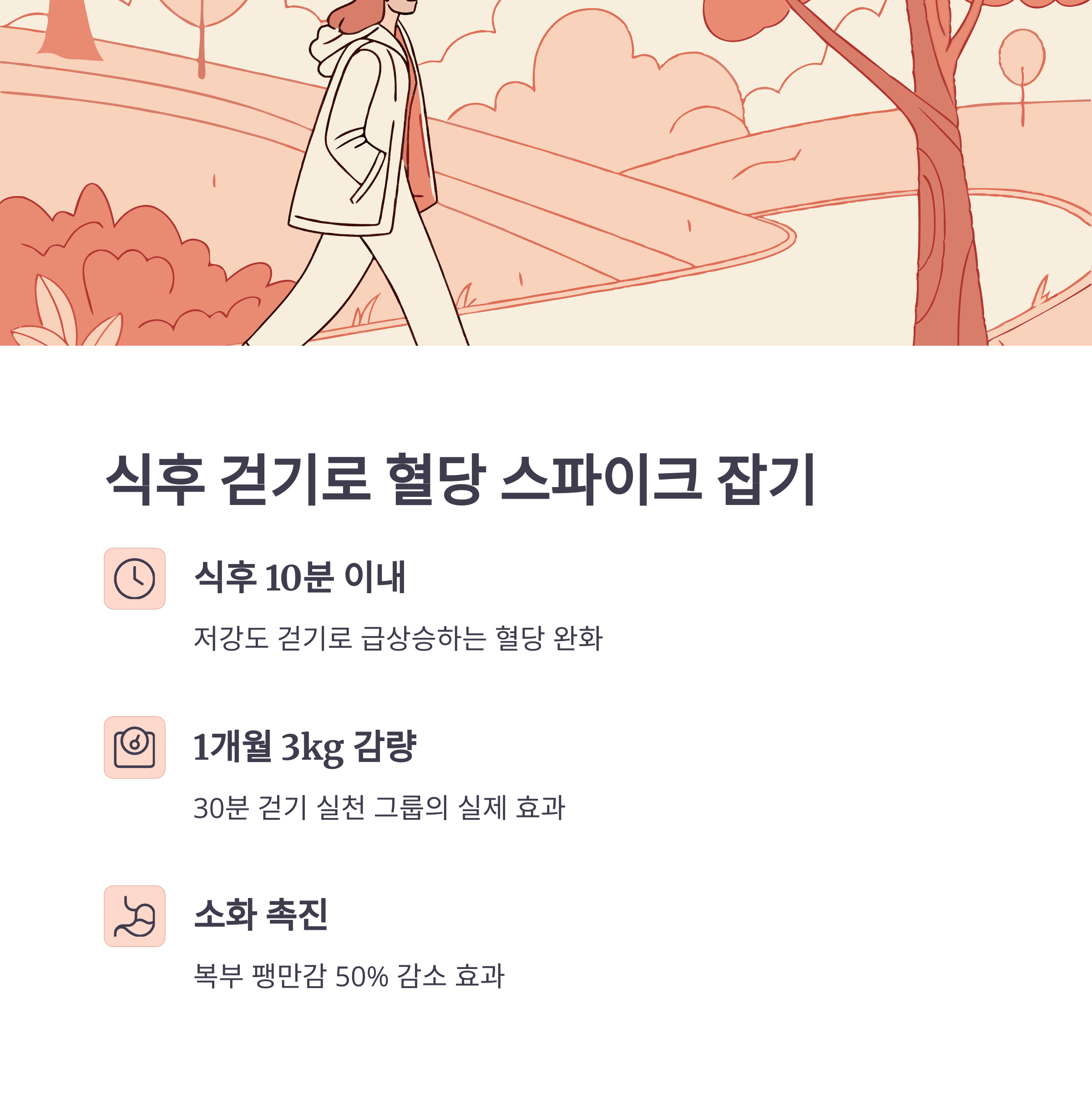 | 점심/저녁 | 식후 10~15분 저강도 걷기 | 혈당 관리, 소화 개선, 복부 팽만감 완화 |