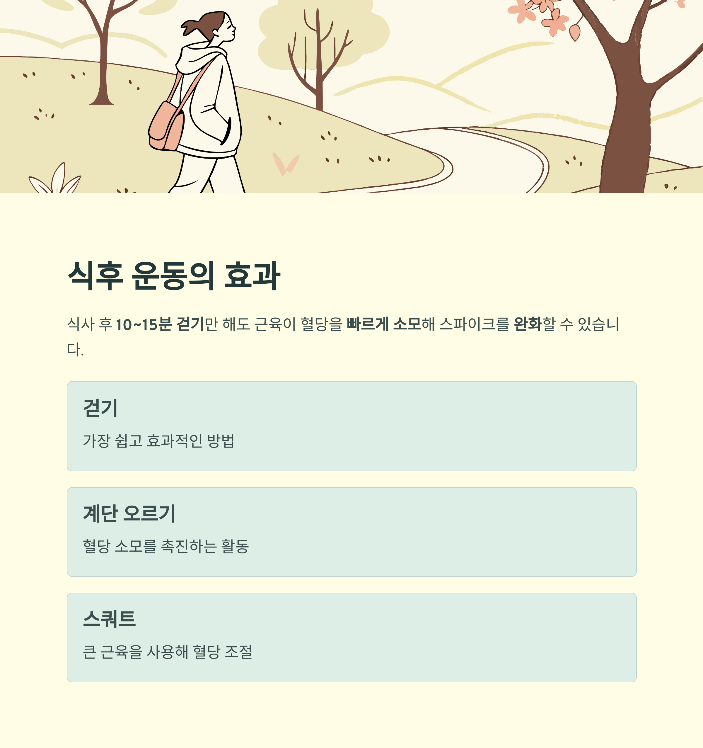 | 식사 후 10~15분 걷기 | 혈당 조기 하강 | 운동 시 혈당 소모 촉진 |