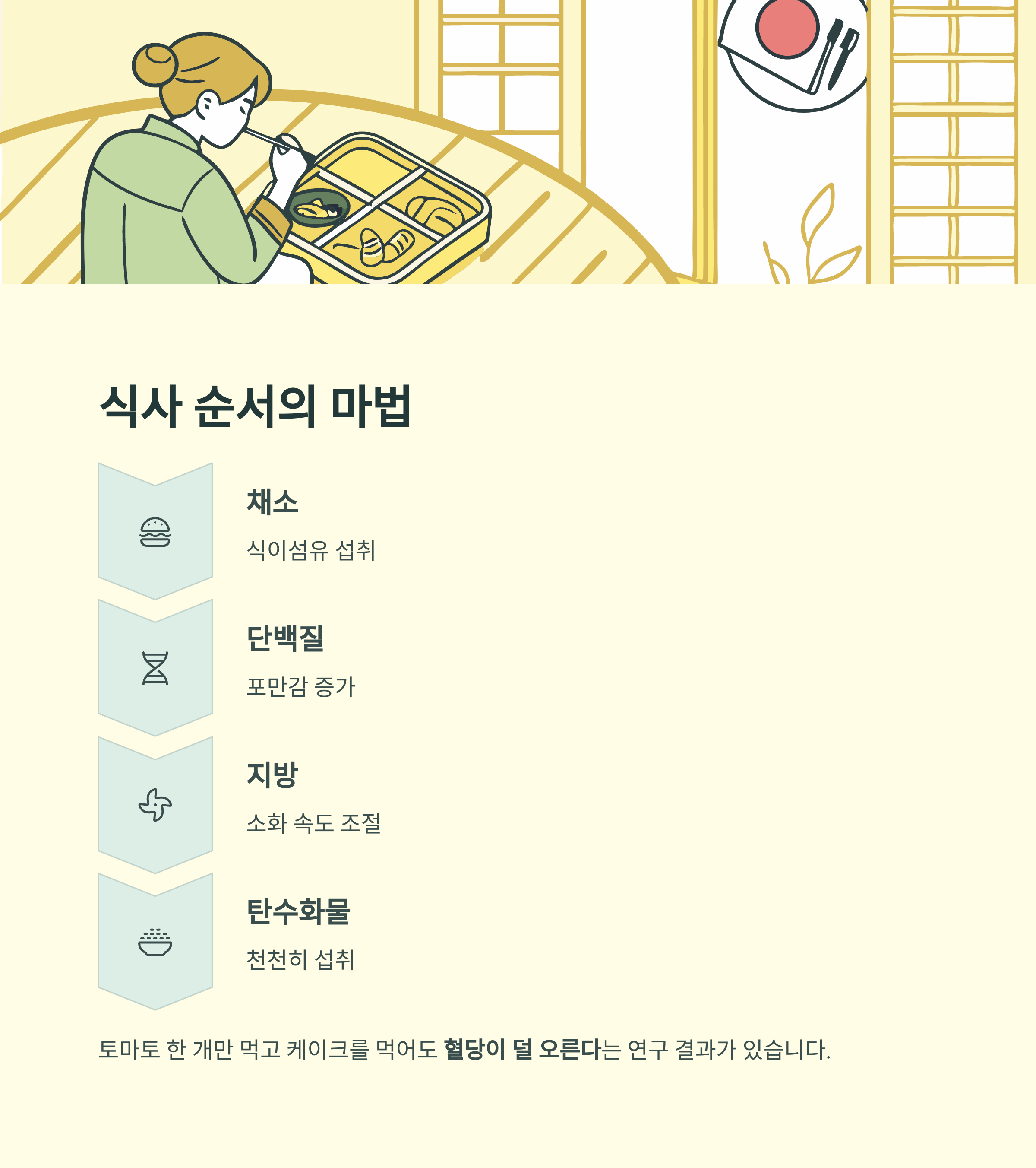식사 순서만 바꿔도 혈당 상승 속도를 늦출 수 있습니다.