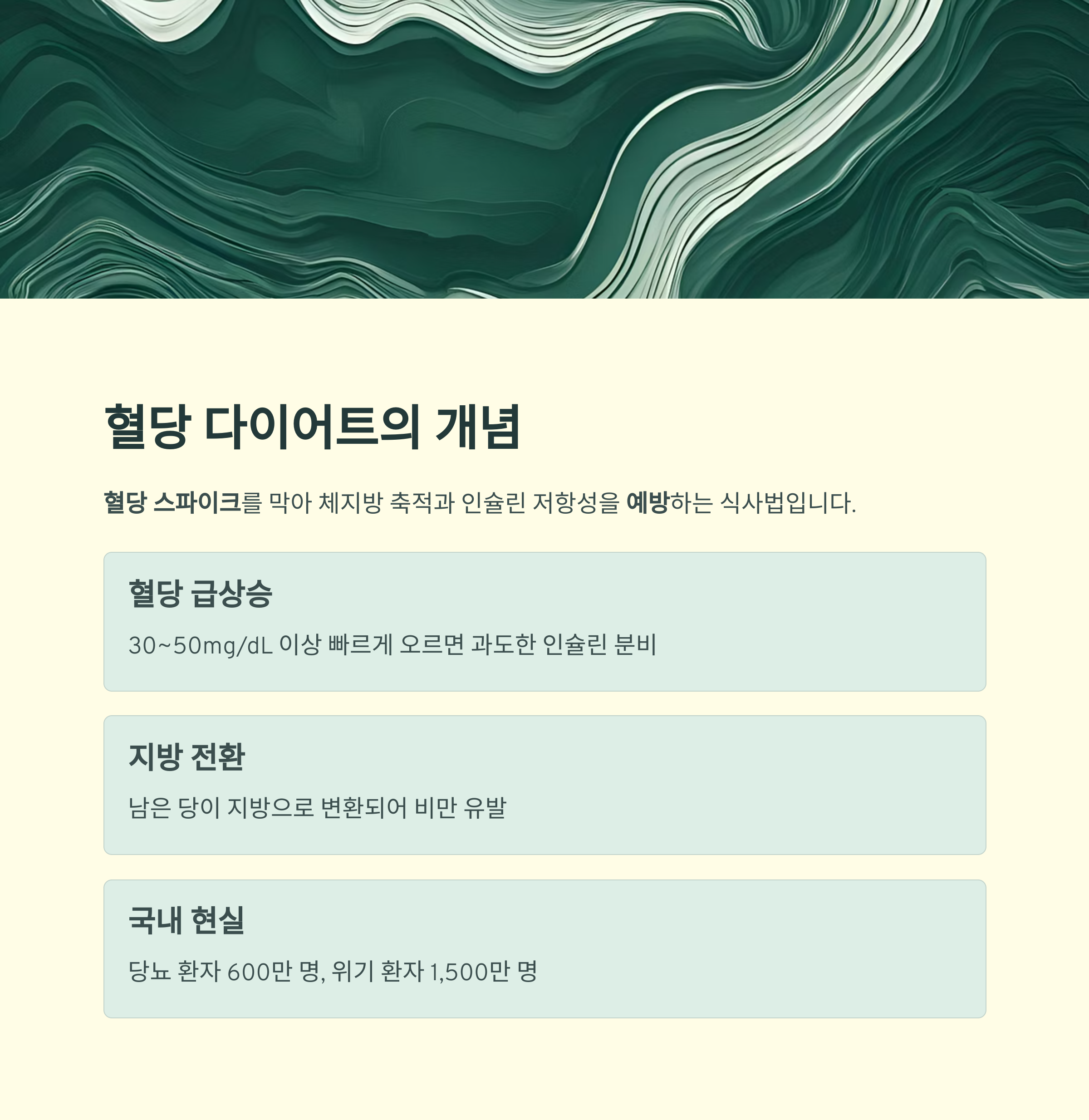 | 단순당·정제 탄수화물 제한 | 급격한 혈당 상승 방지 | 당류 섭취 시 혈당 급상승 |