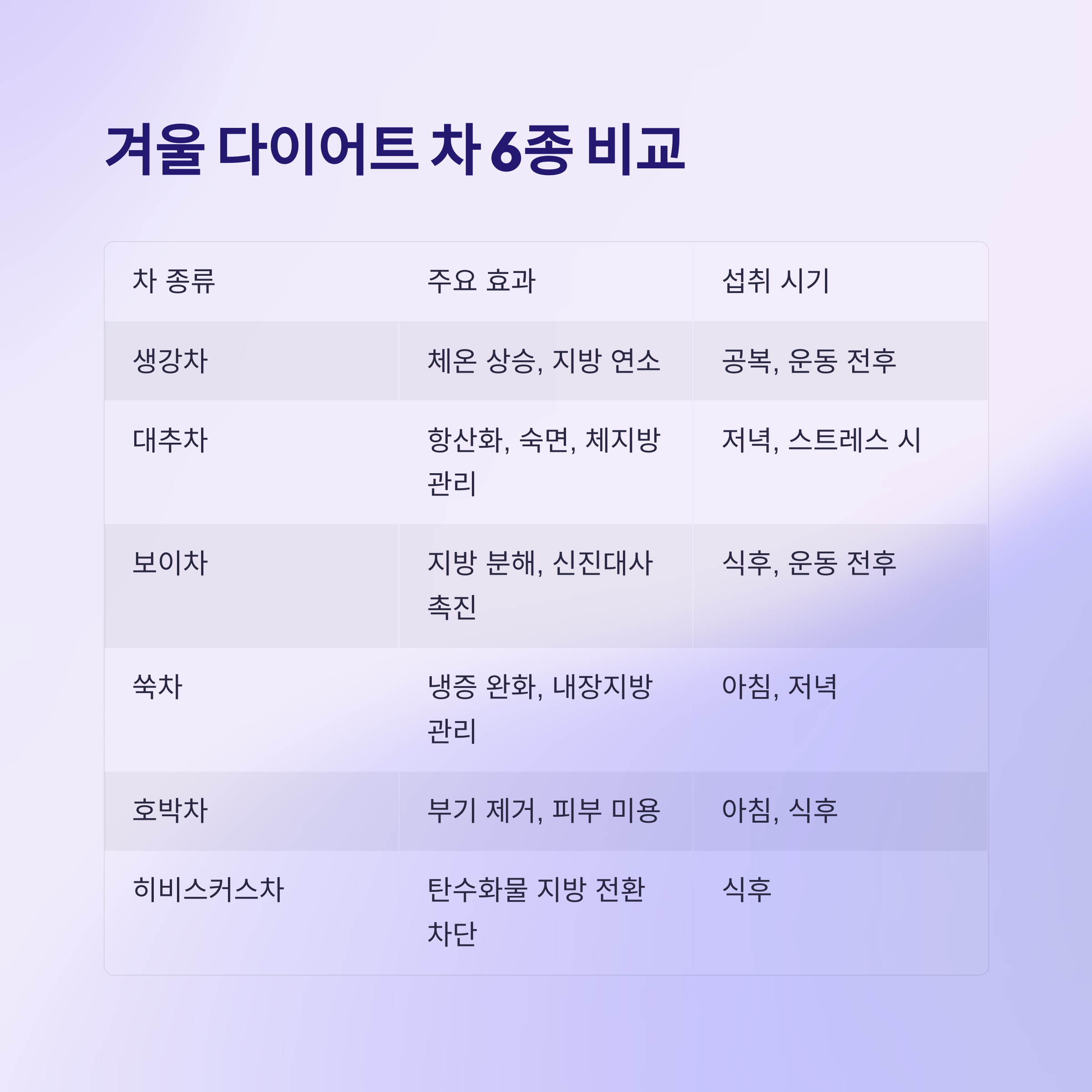 | 생강차 | 체온 상승, 지방 연소 | 80~90kcal | 공복, 운동 전후 | 밤 늦게 섭취 주의 |