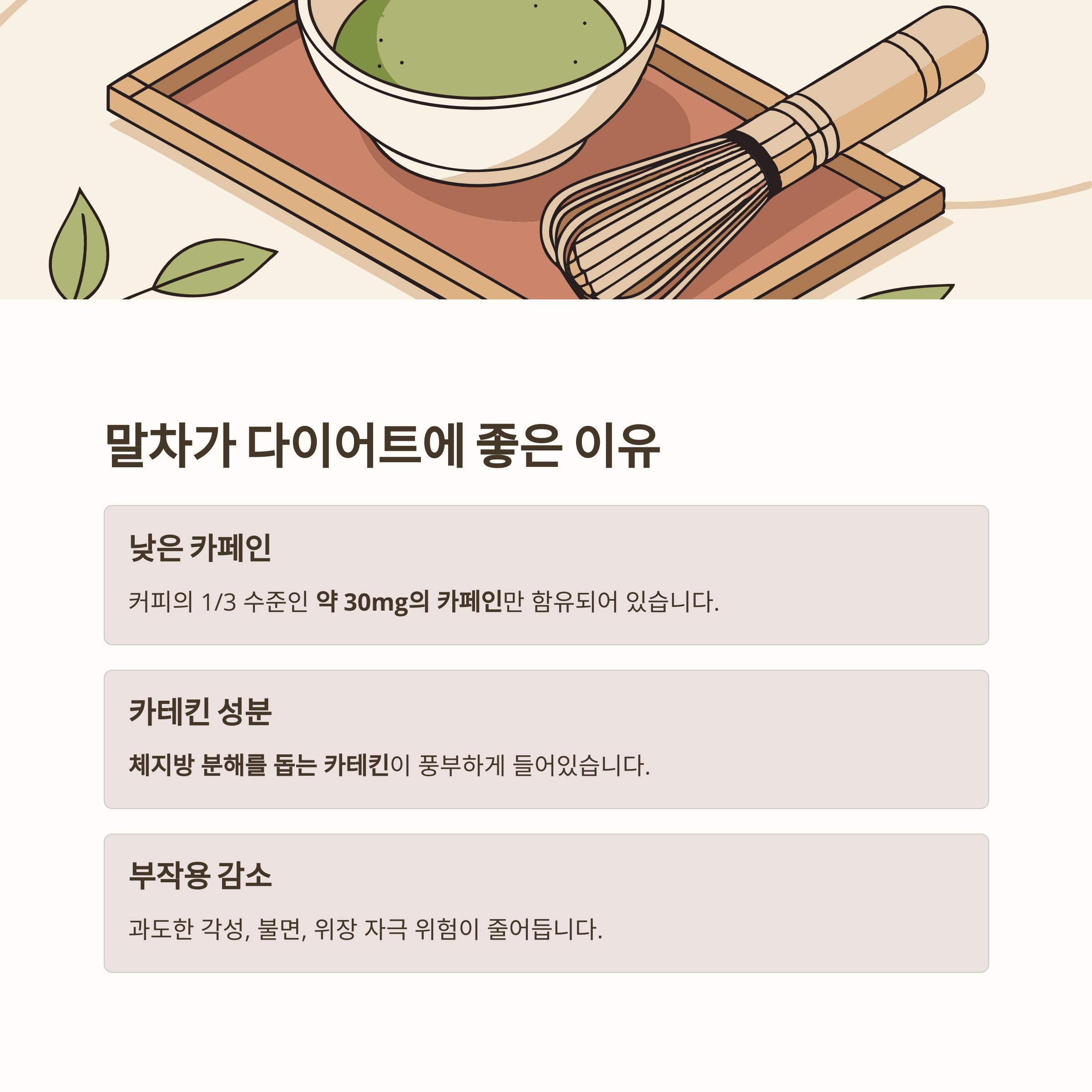 | 커피 대신 말차 섭취 | 카페인 과다 줄이고 체지방 분해 및 신진대사 촉진 |