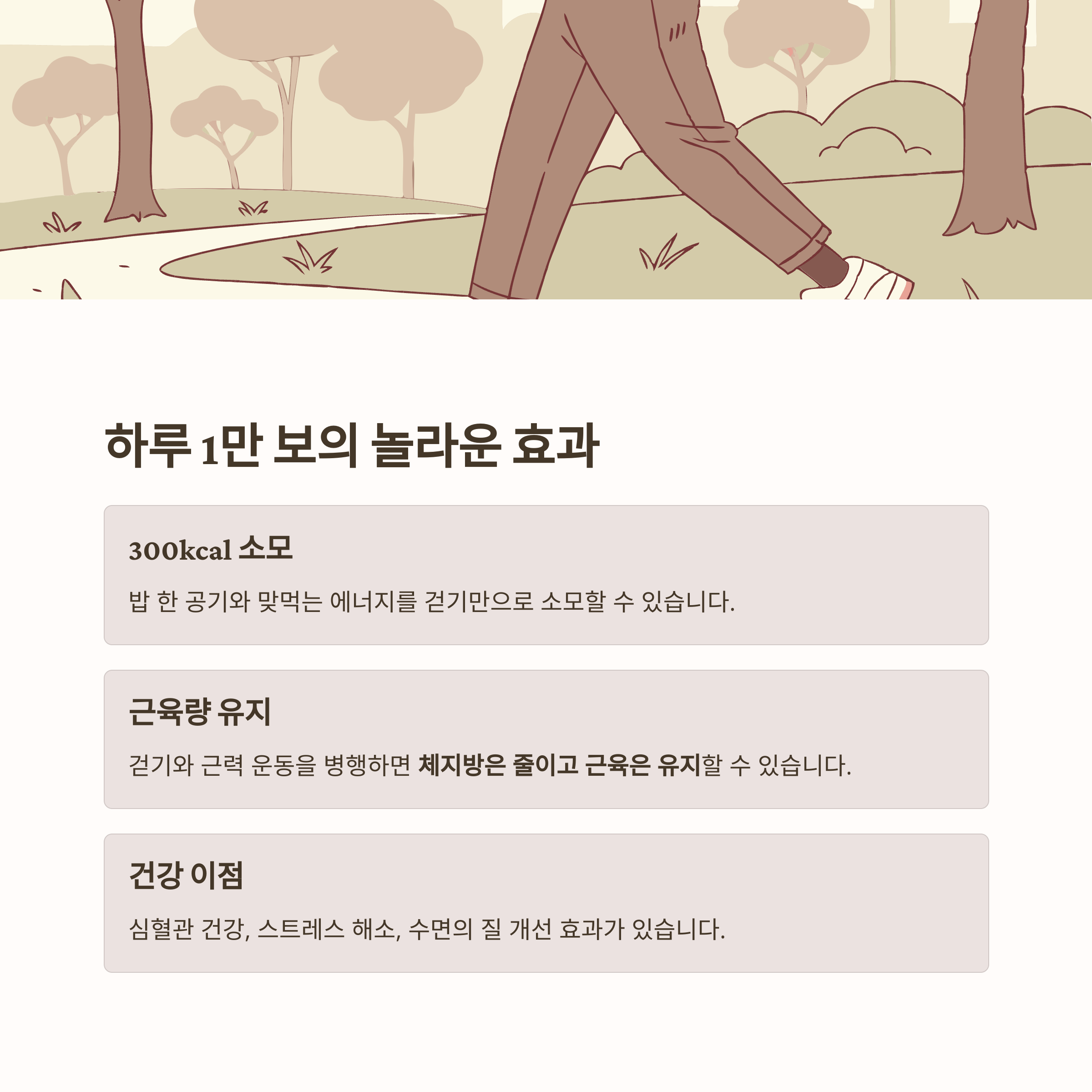 | 하루 1만 보 걷기 | 300kcal 소모, 심혈관 건강 및 근육량 유지 |