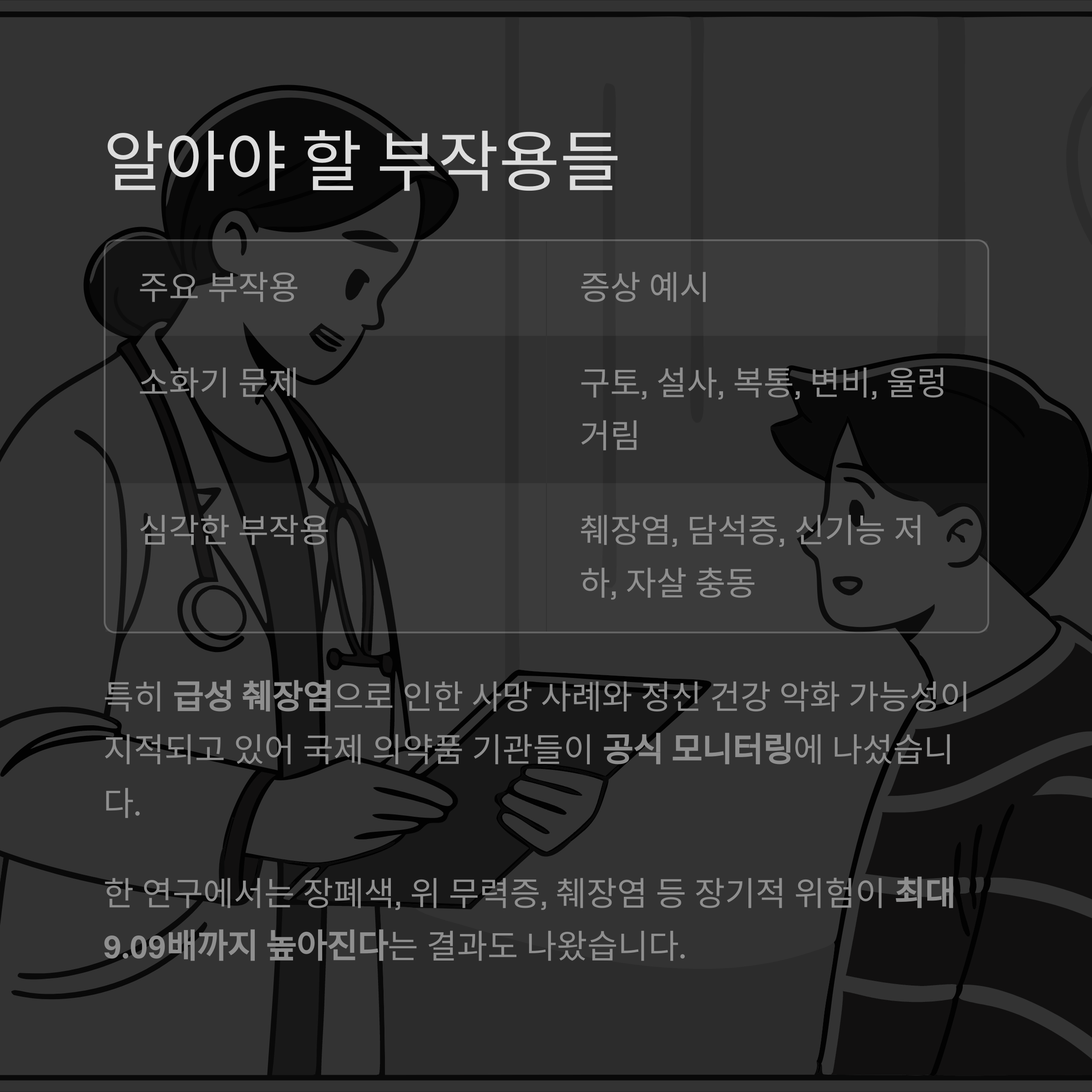 | 심각한 부작용 | 췌장염, 담석증, 신기능 저하, 자살 충동 |
