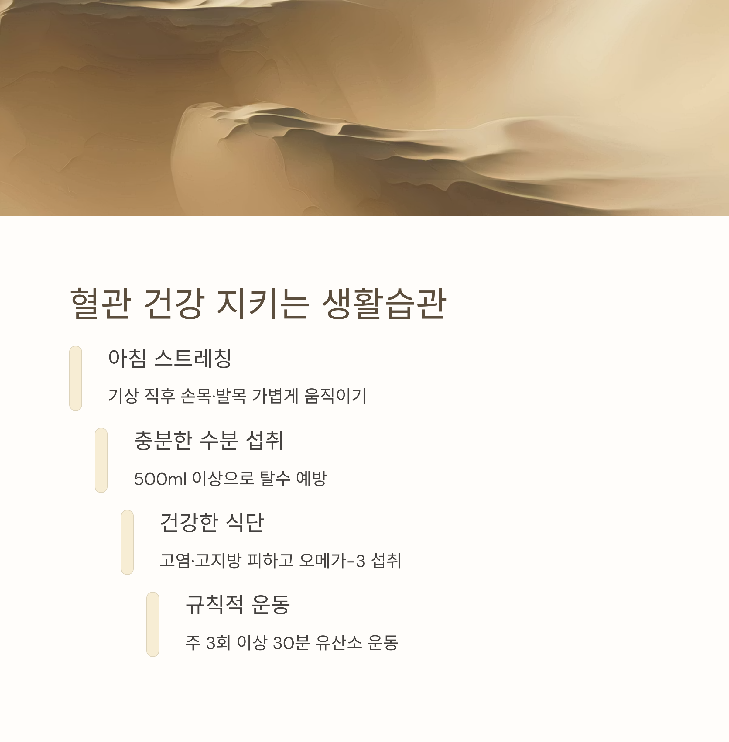 이러한 습관은 단기 증상 완화뿐 아니라, 장기적인 혈관 질환 예방에 핵심적인 역할을 합니다