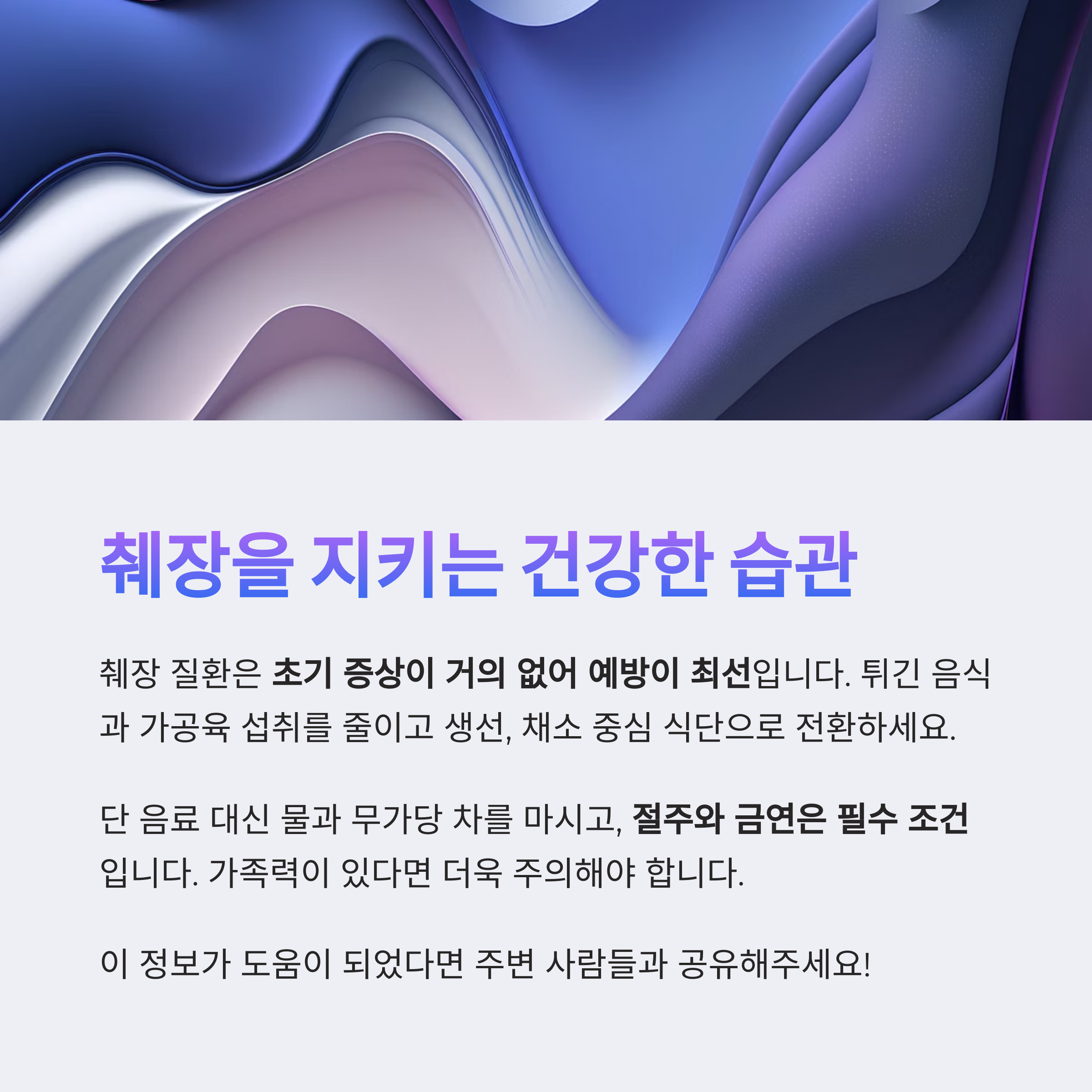 셋째, 절주와 금연은 필수 조건입니다. 특히 가족력이 있다면 더욱 주의해야 합니다.