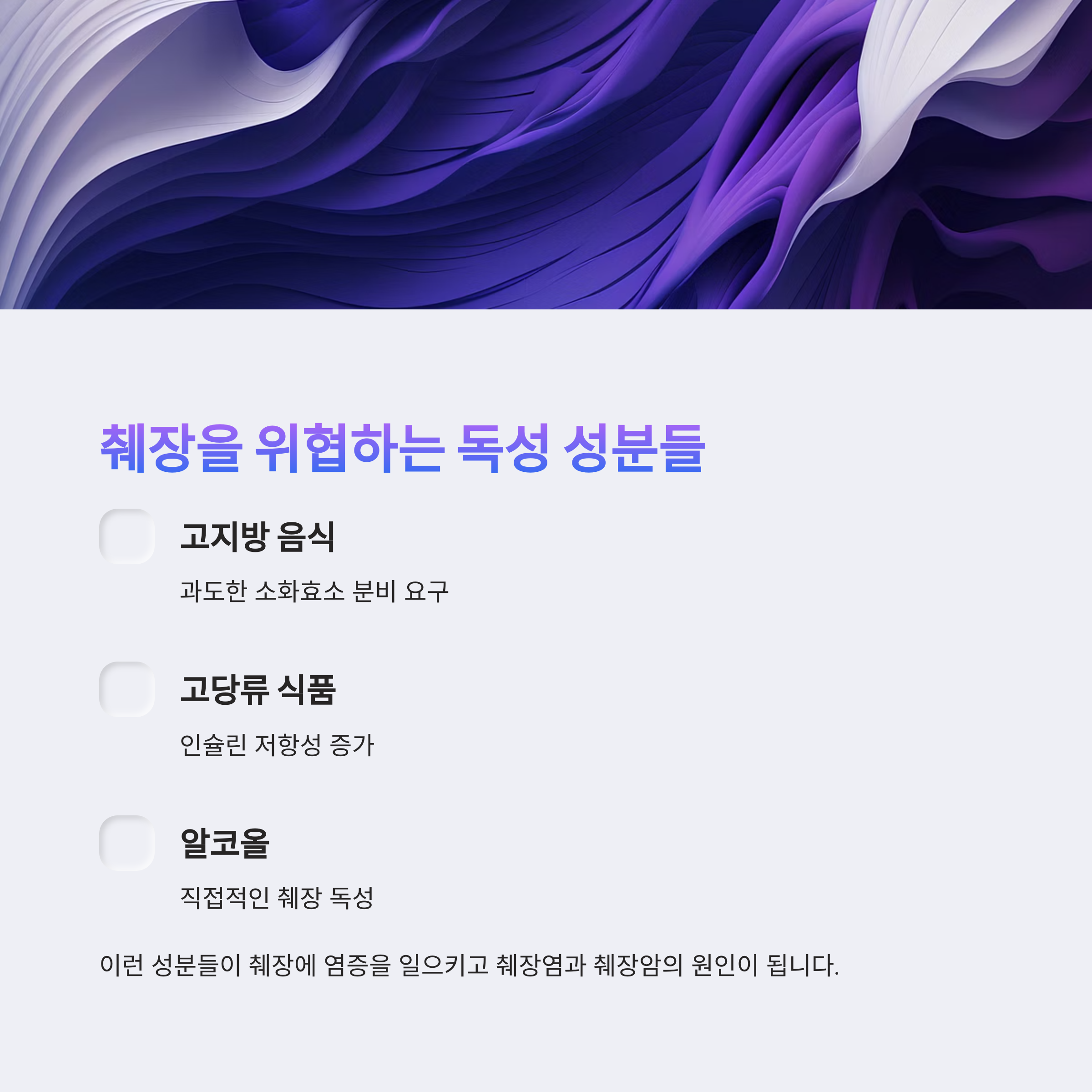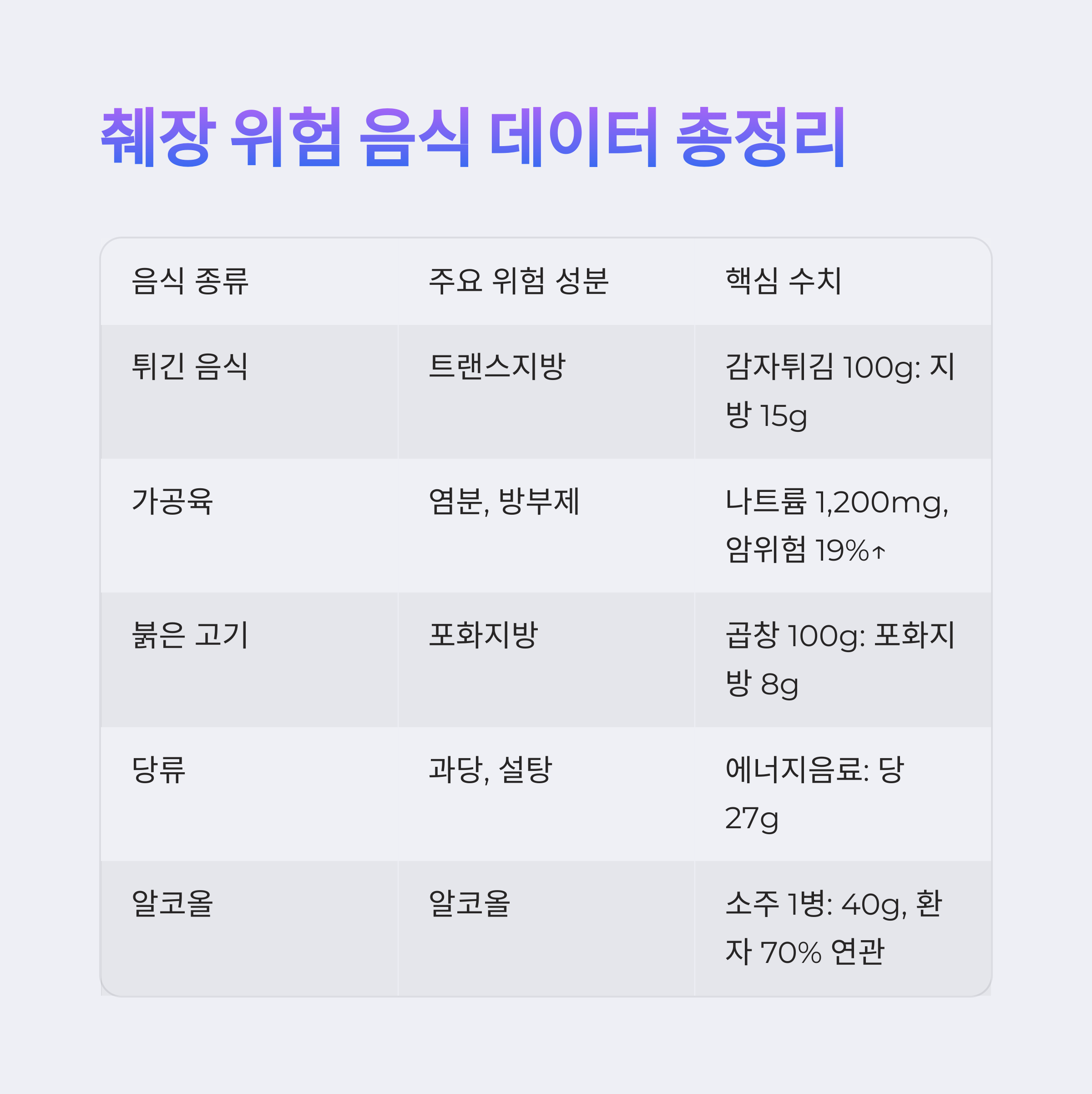 췌장은 고지방, 고당류, 알코올 등의 독성 성분에 매우 민감한 기관입니다. 이런 성분은 췌장에 염증을 일으키고, 장기적으로는 췌장염과 췌장암의 원인이 됩니다. 아래에서 각 음식의 위험성과 주요 데이터를 함께 살펴보겠습니다.