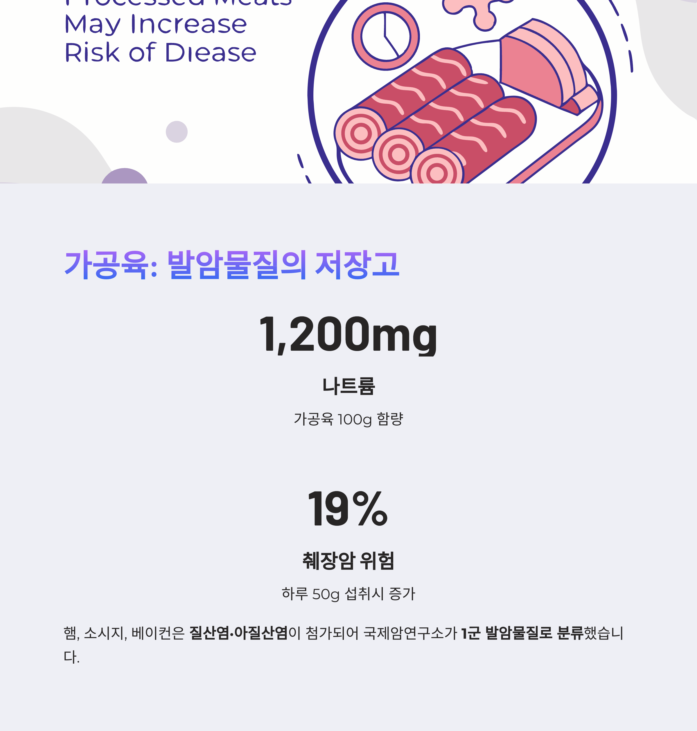가공육 100g은 나트륨이 최대 1,200mg으로, 하루 권장량의 절반에 해당합니다. 또 하루 50g 섭취로도 췌장암 위험이 19% 증가합니다.