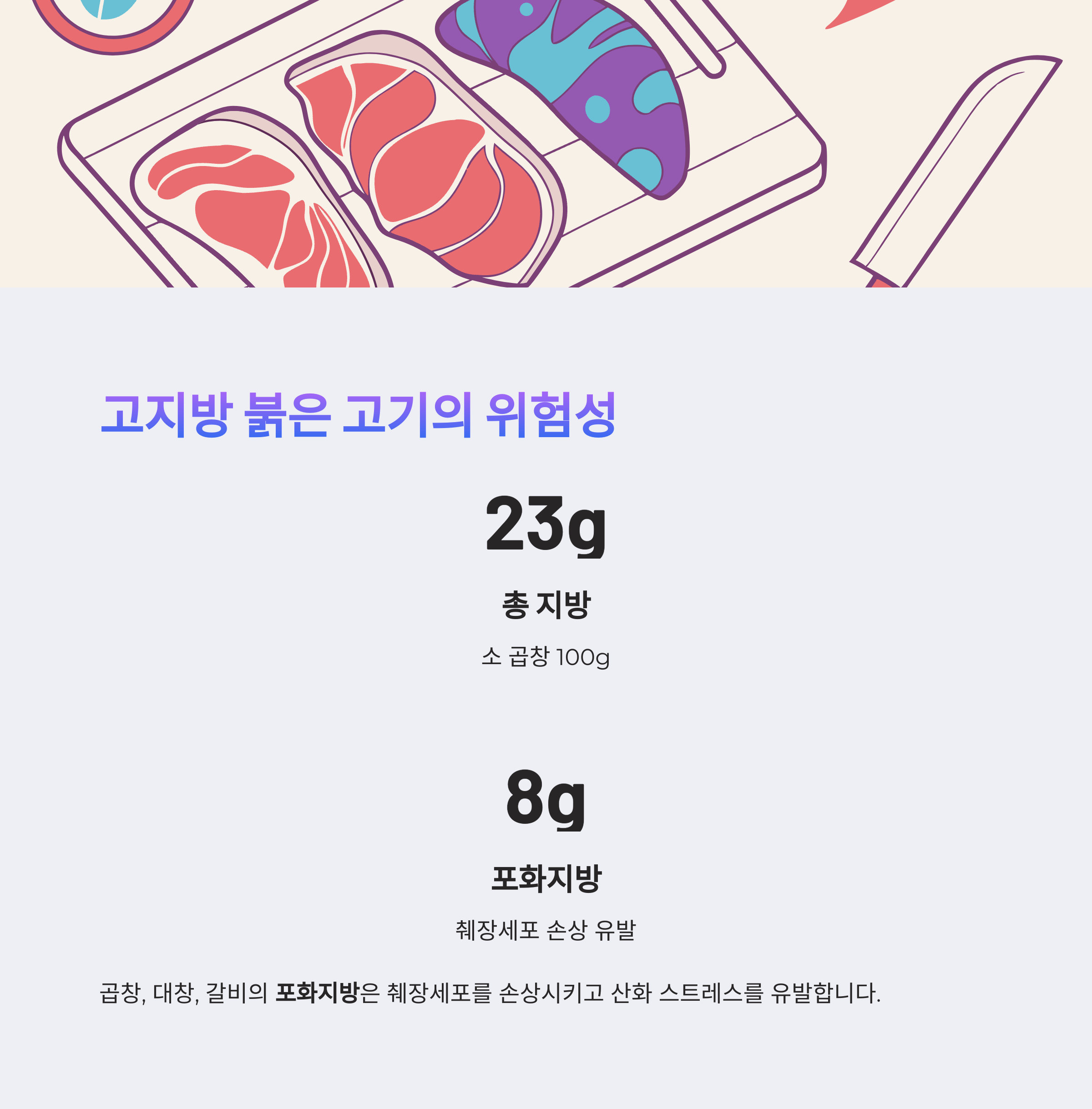붉은 고기(곱창 등) 포화지방 곱창 100g: 지방 23g, 포화지방 8g 세포 손상, 만성 췌장염, 췌장암 위험 증가