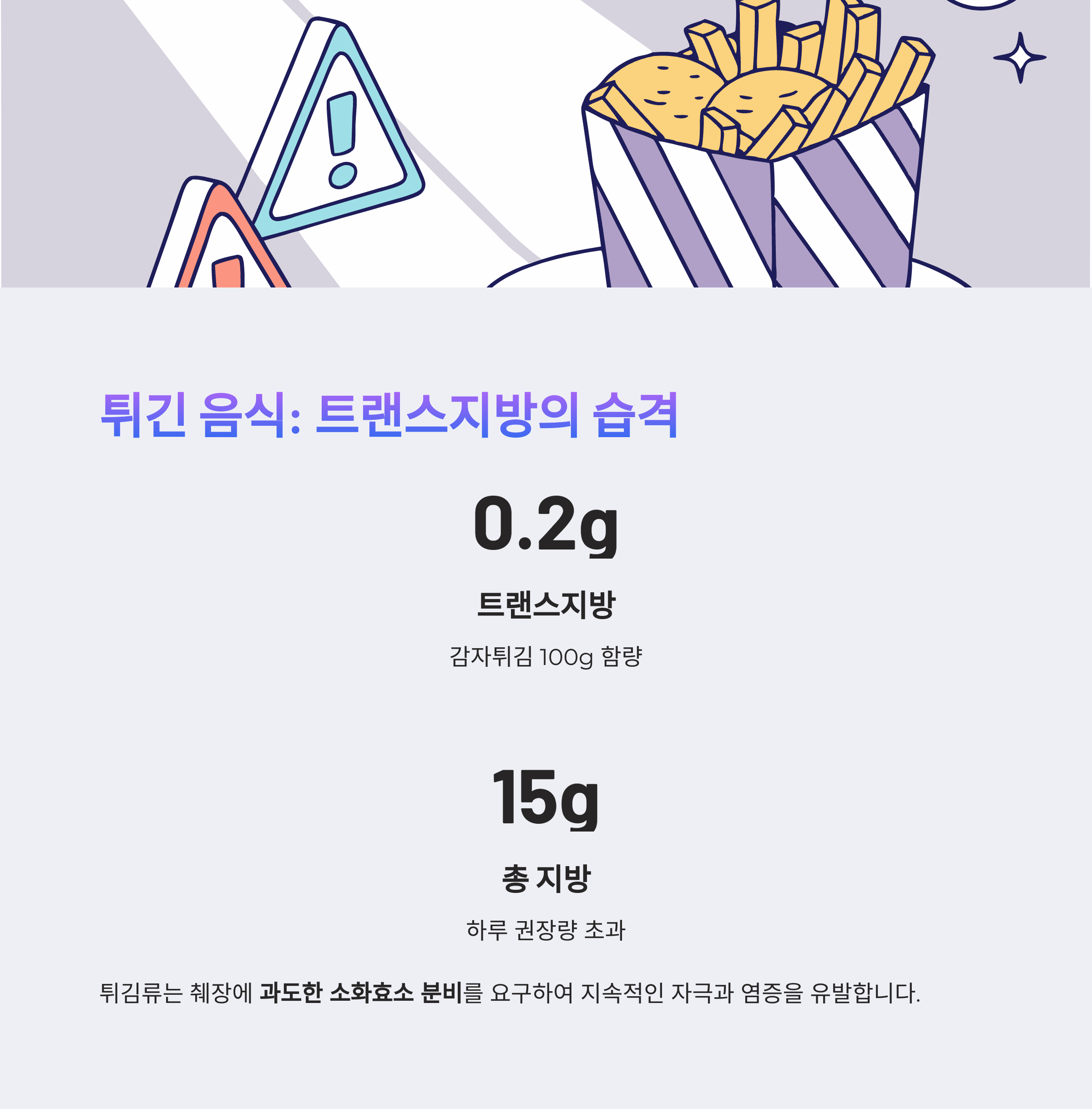 튀긴 음식(감자튀김 등) 포화·트랜스지방 감자튀김 100g: 지방 15g, 트랜스지방 0.2g 염증 유발, 만성 췌장염, 췌장암 위험 증가