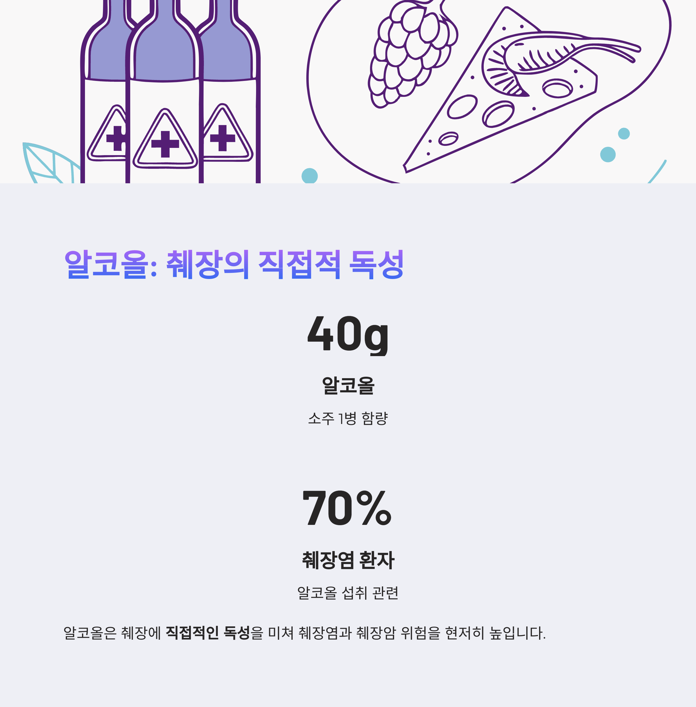 알코올은 췌장에 직접적인 독성을 미칩니다. 특히 소주 1병에는 알코올 40g이 포함되어, 장기 복용 시 췌장염과 췌장암의 위험을 현저히 높입니다.