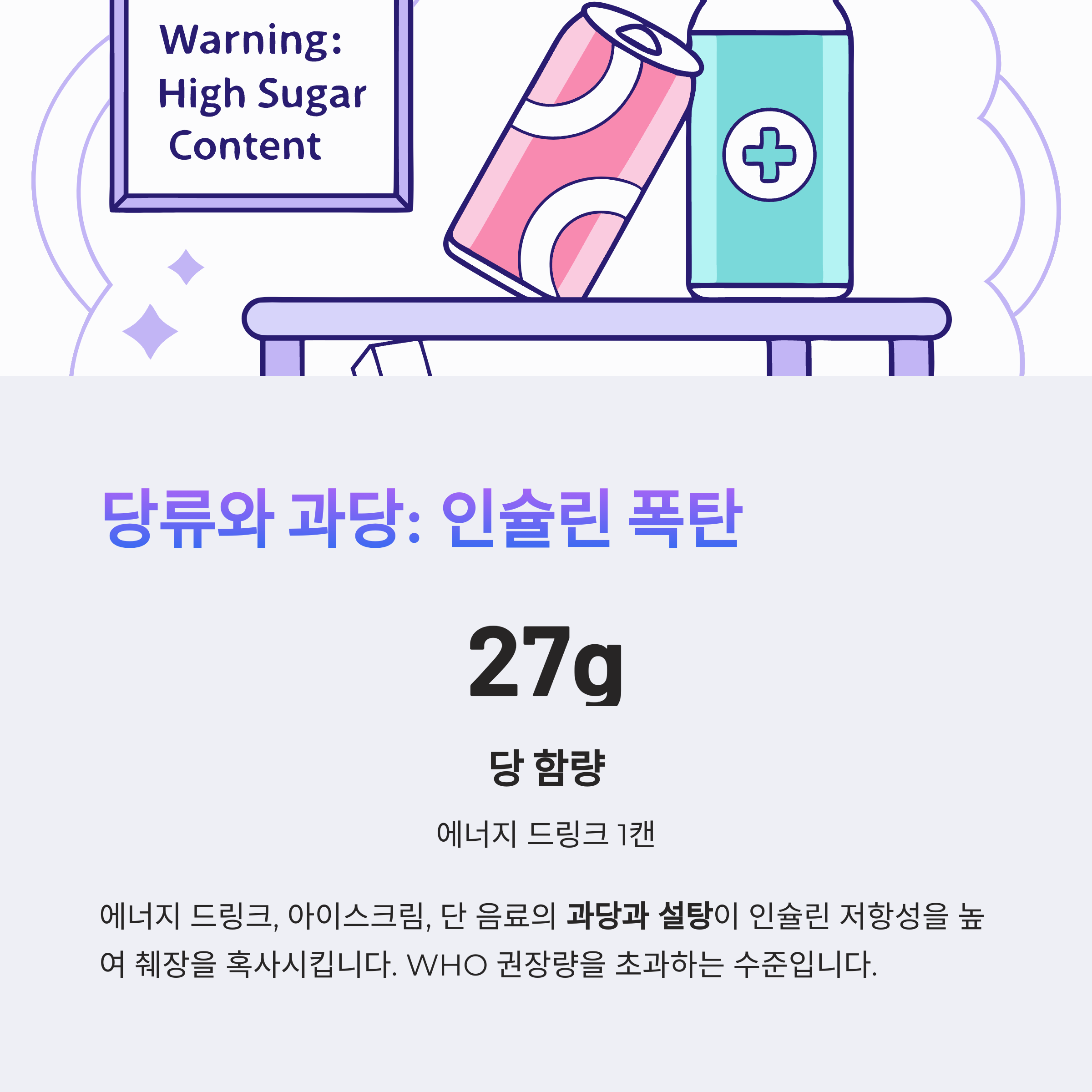 | 당류(에너지음료 등) | 과당, 설탕 | 에너지 드링크 1캔: 당 27g | 인슐린 저항성, 염증, 산화 손상 |