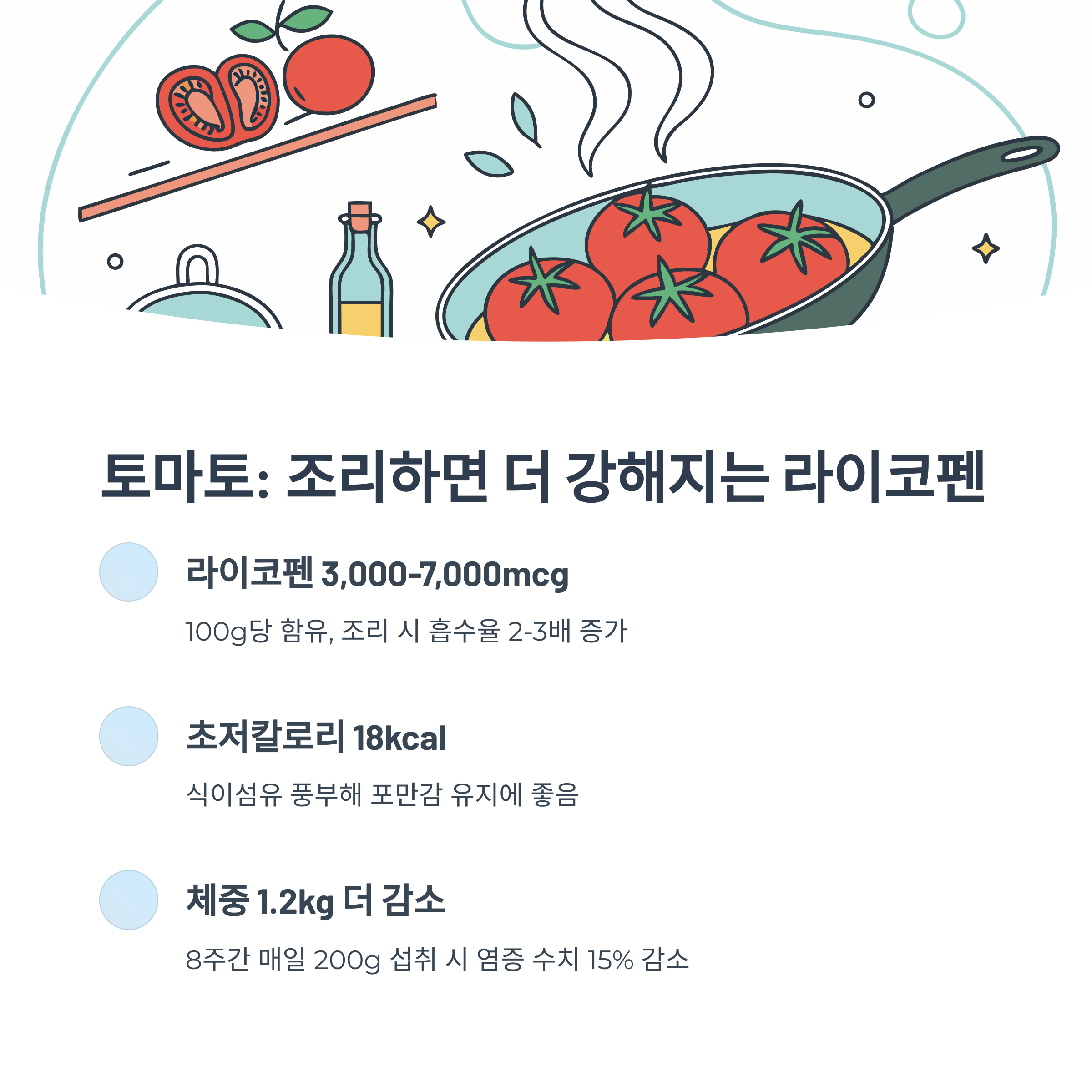 | 토마토 | 라이코펜, 비타민C | 18kcal | 1g | 1.2g | 포만감, 항산화, 조리 시 효과↑ |