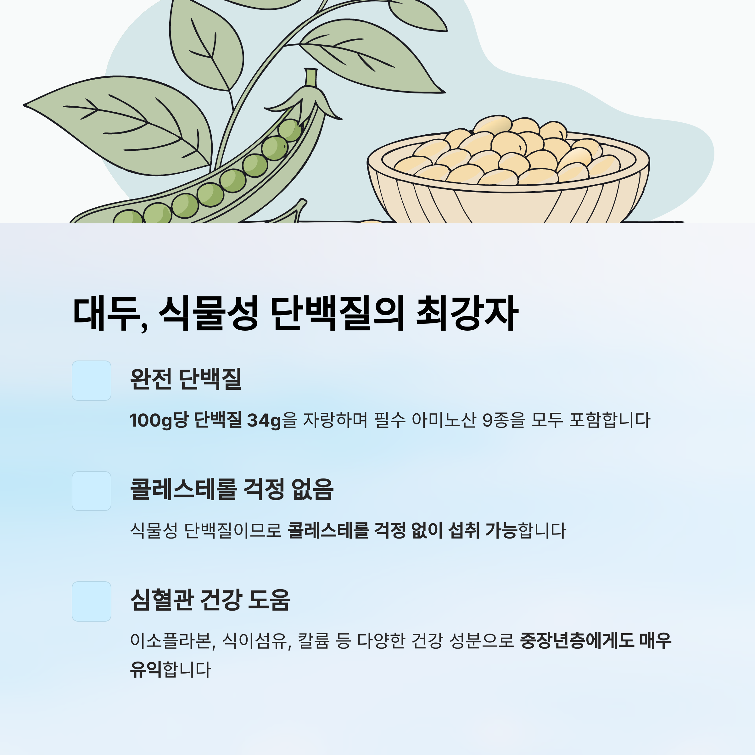 콩은 식물성 단백질 중 단연 으뜸으로 손꼽힙니다