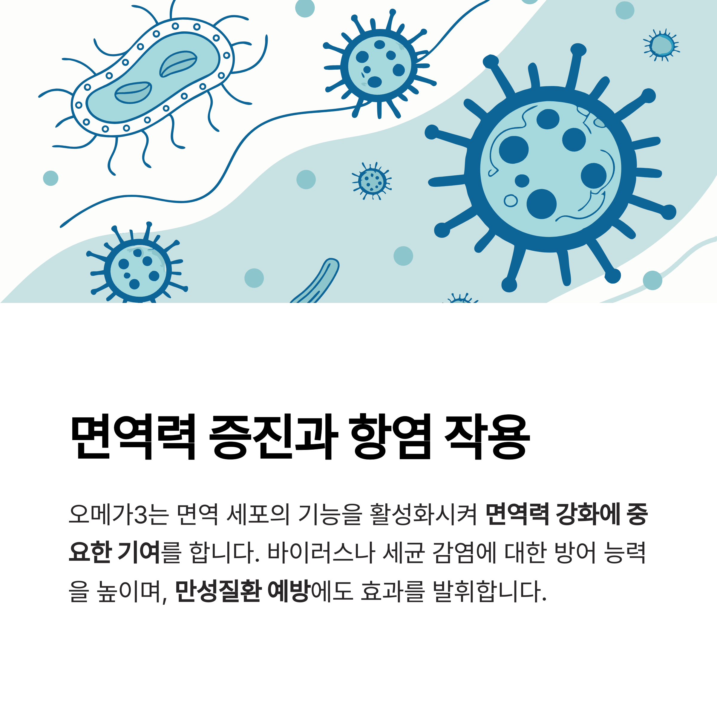 오메가3는 면역 세포의 기능을 활성화시켜 면역력 강화에 중요한 기여를 합니다.
