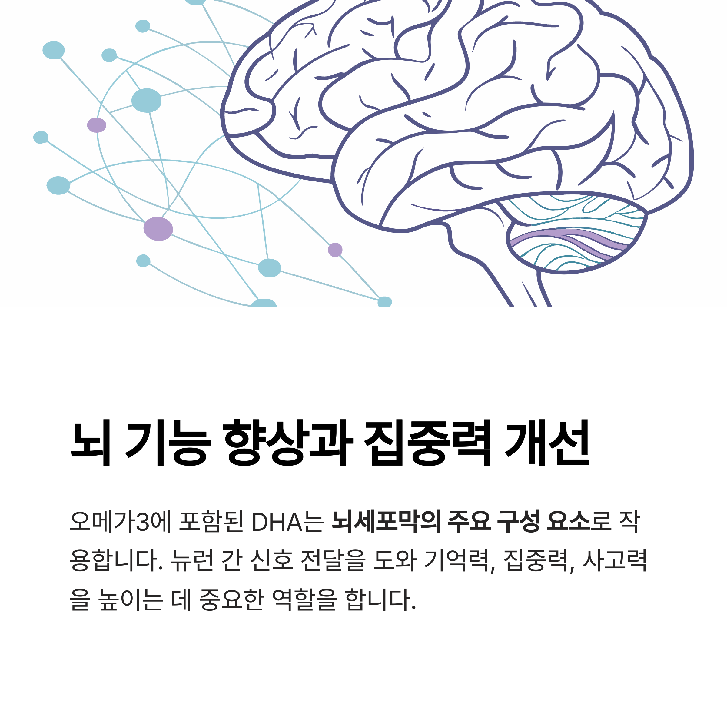 오메가3에 포함된 DHA는 뇌세포막의 주요 구성 요소로 작용합니다.