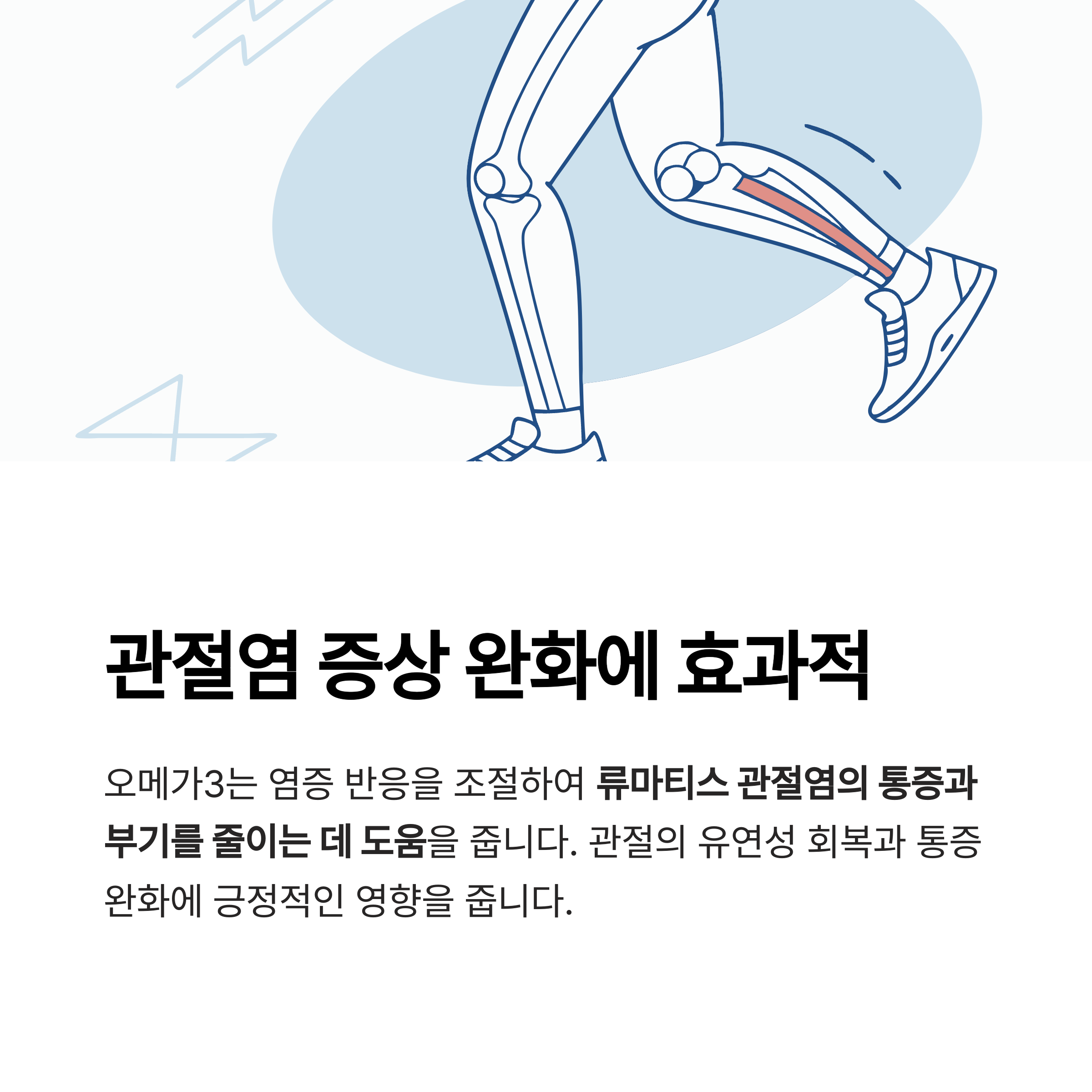오메가3는 염증 반응을 조절하여 류마티스 관절염의 통증과 부기를 줄이는 데 도움을 줍니다.