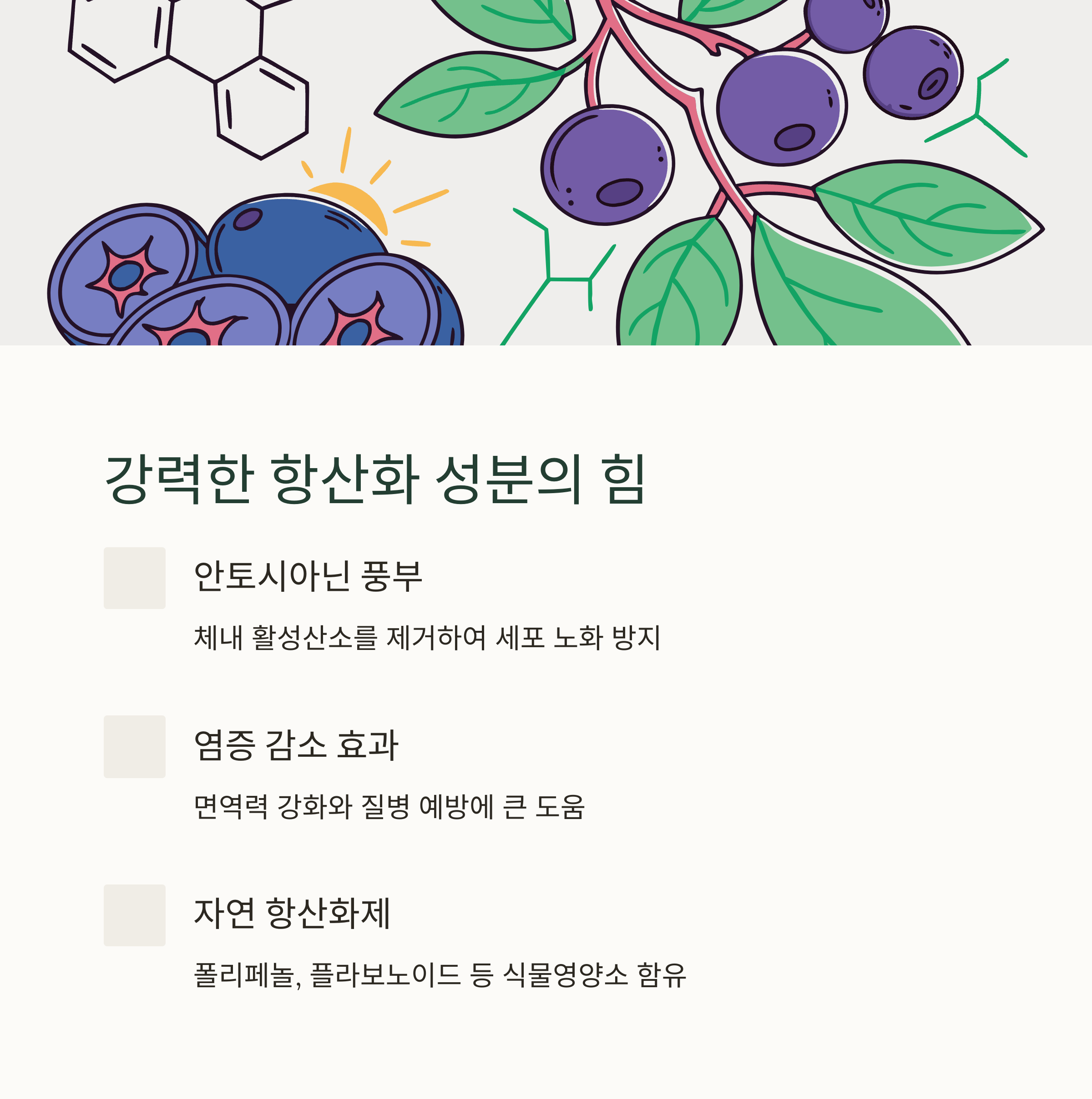 이 성분은 체내 활성산소를 제거하여 세포의 노화를 막고, 염증을 줄여줍니다