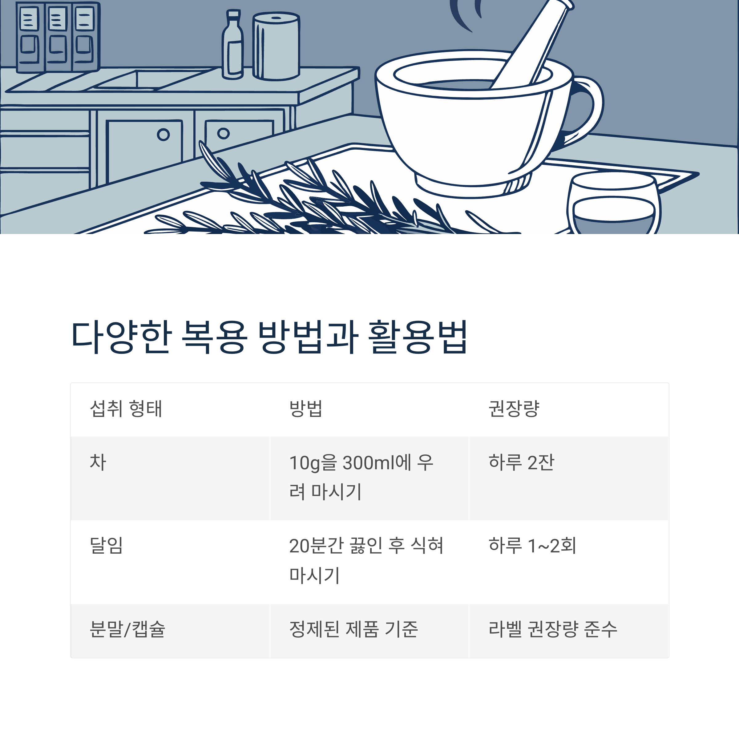 | 달임 | 20분간 끓인 후 식혀 마시기 | 하루 1~2회 |
