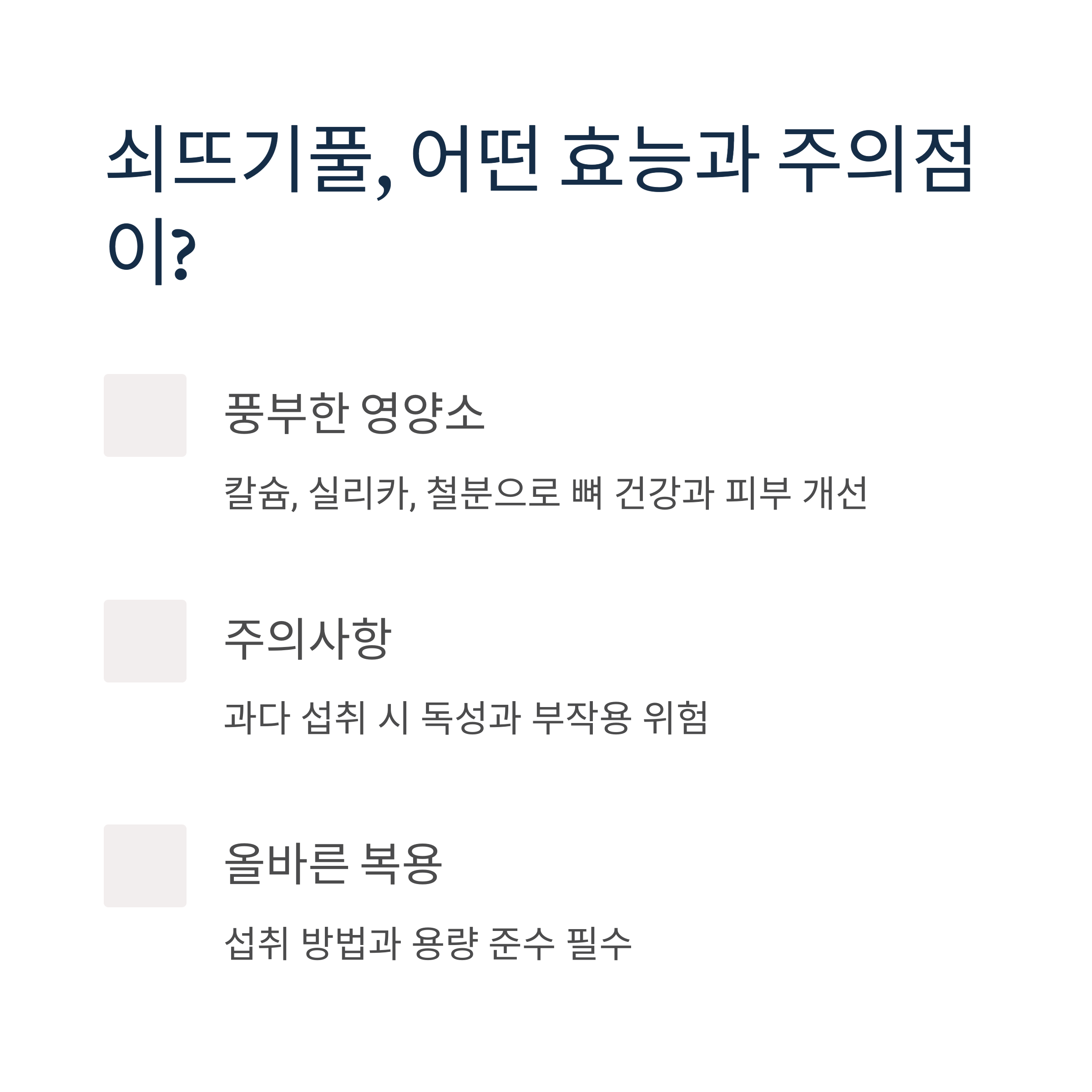 특히 철분과 칼슘, 실리카가 풍부해 빈혈, 골다공증, 손톱·모발 강화에도 효과가 있습니다.