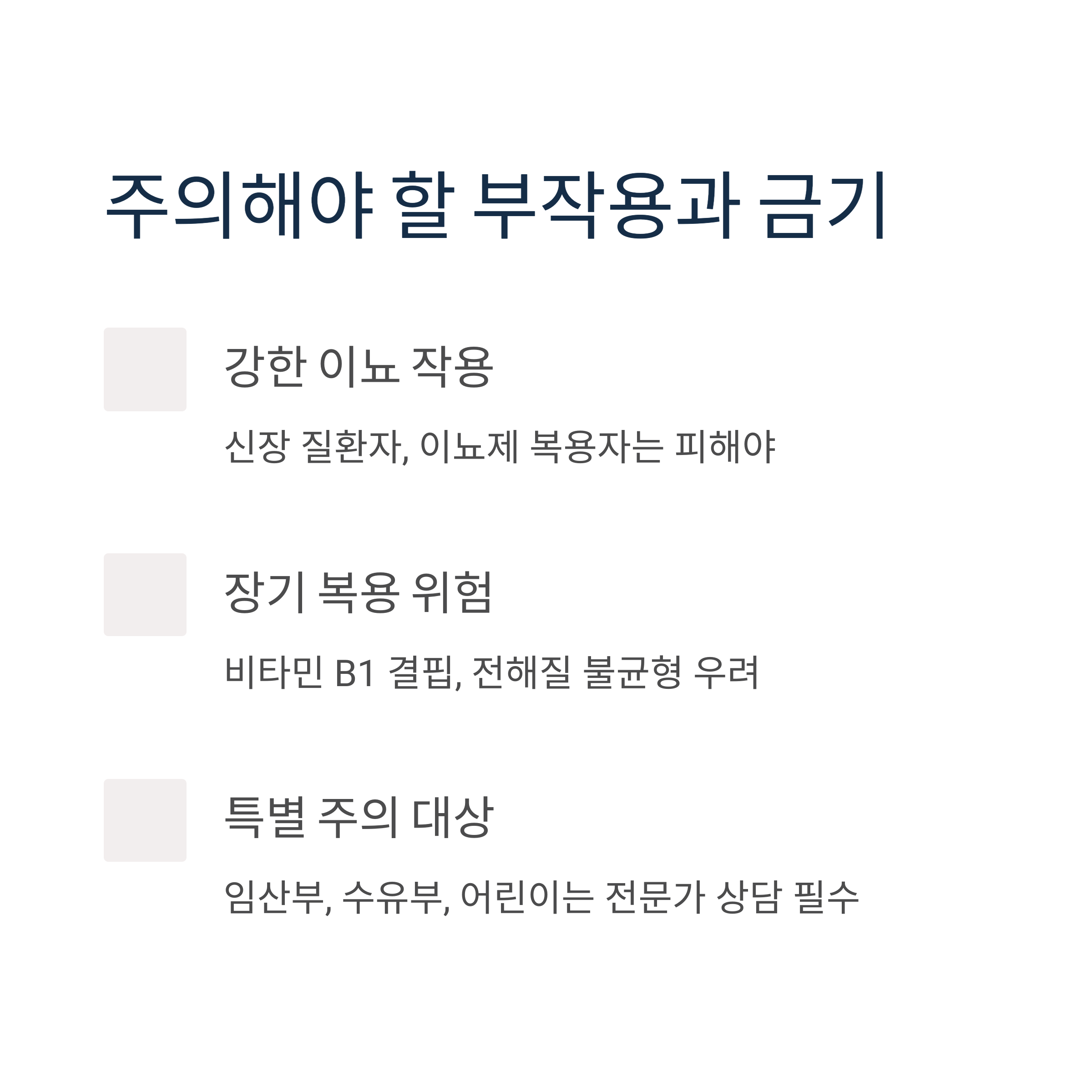 | 신장 질환 여부 확인 | 있다면 복용 금지 |