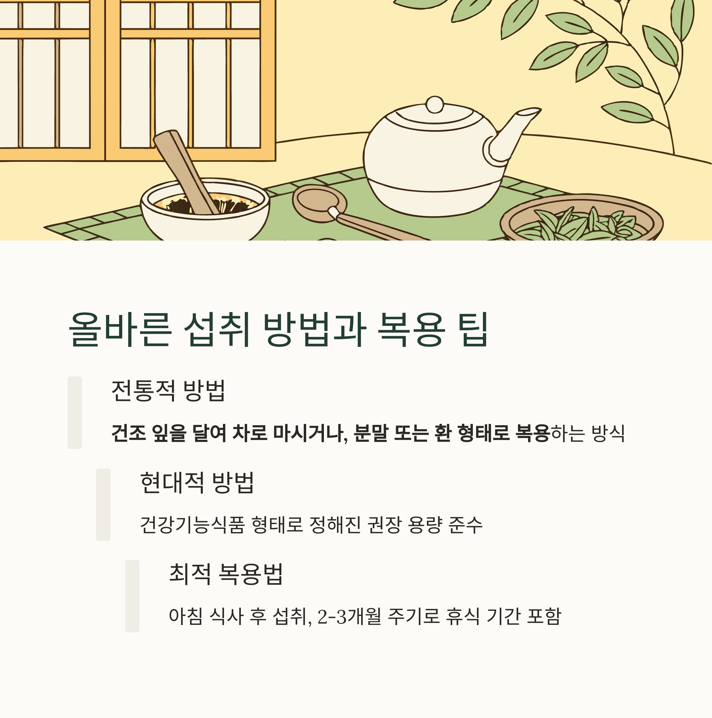 전통적으로는 건조 잎을 달여 차로 마시거나, 분말 또는 환 형태로 복용합니다