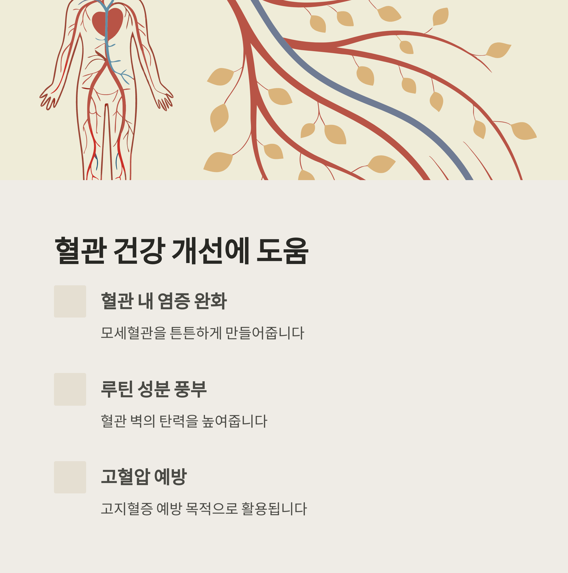 | 혈관 건강 | 모세혈관 강화, 염증 완화 | 고혈압, 고지혈증 예방 |