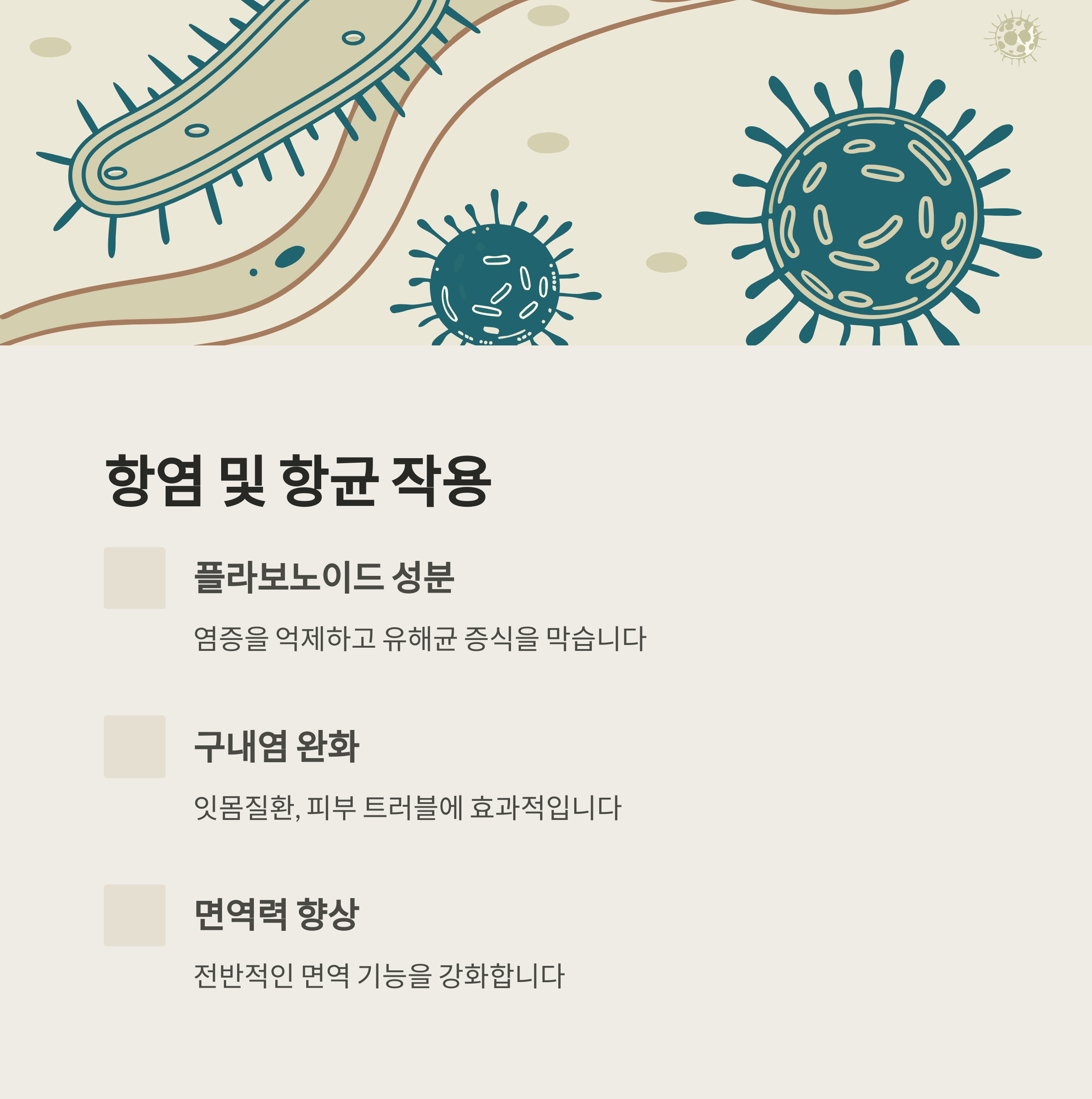 | 항염 작용 | 플라보노이드 성분 다량 함유 | 면역력 강화, 염증 완화 |