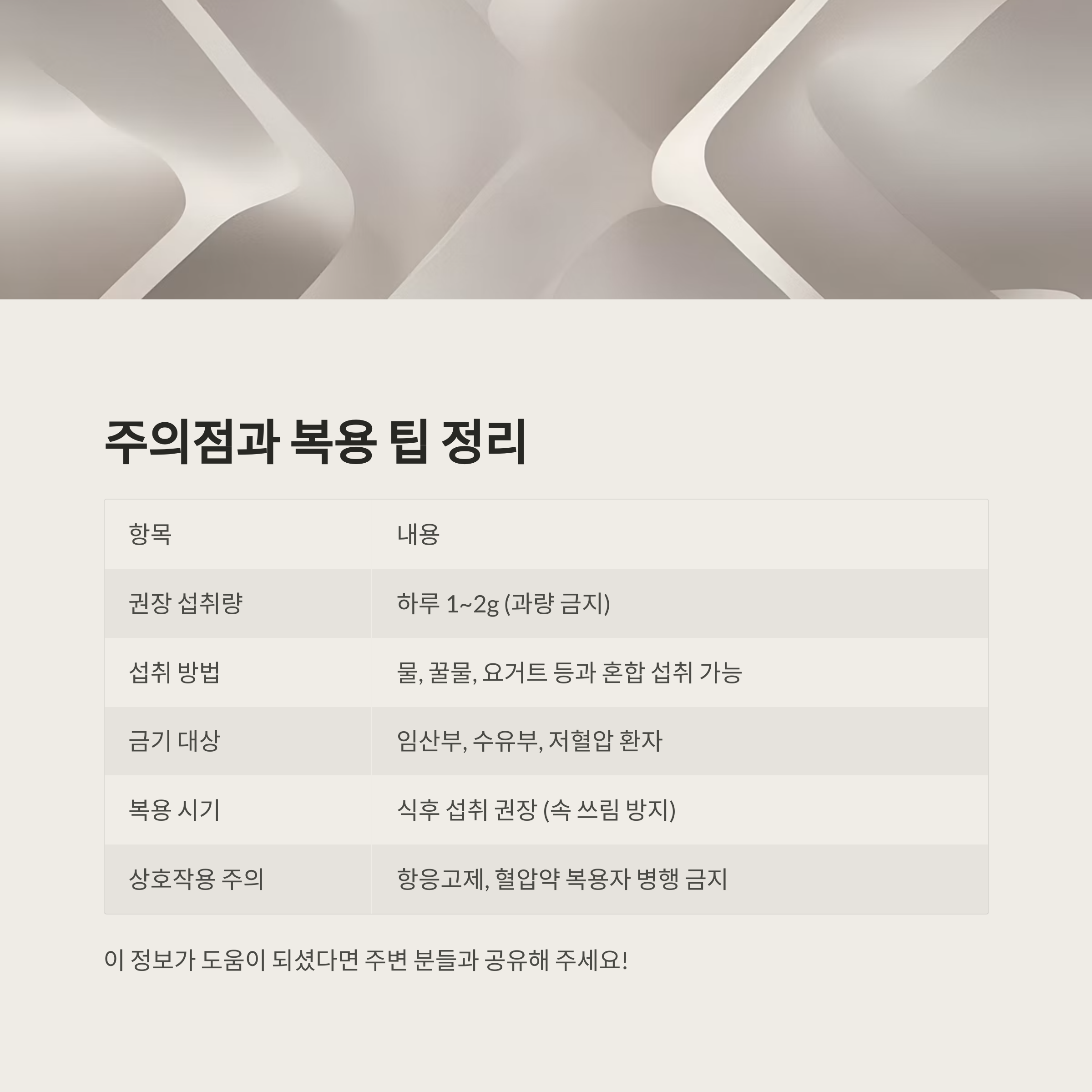| 권장 섭취량 | 하루 1~2g (과량 금지) |