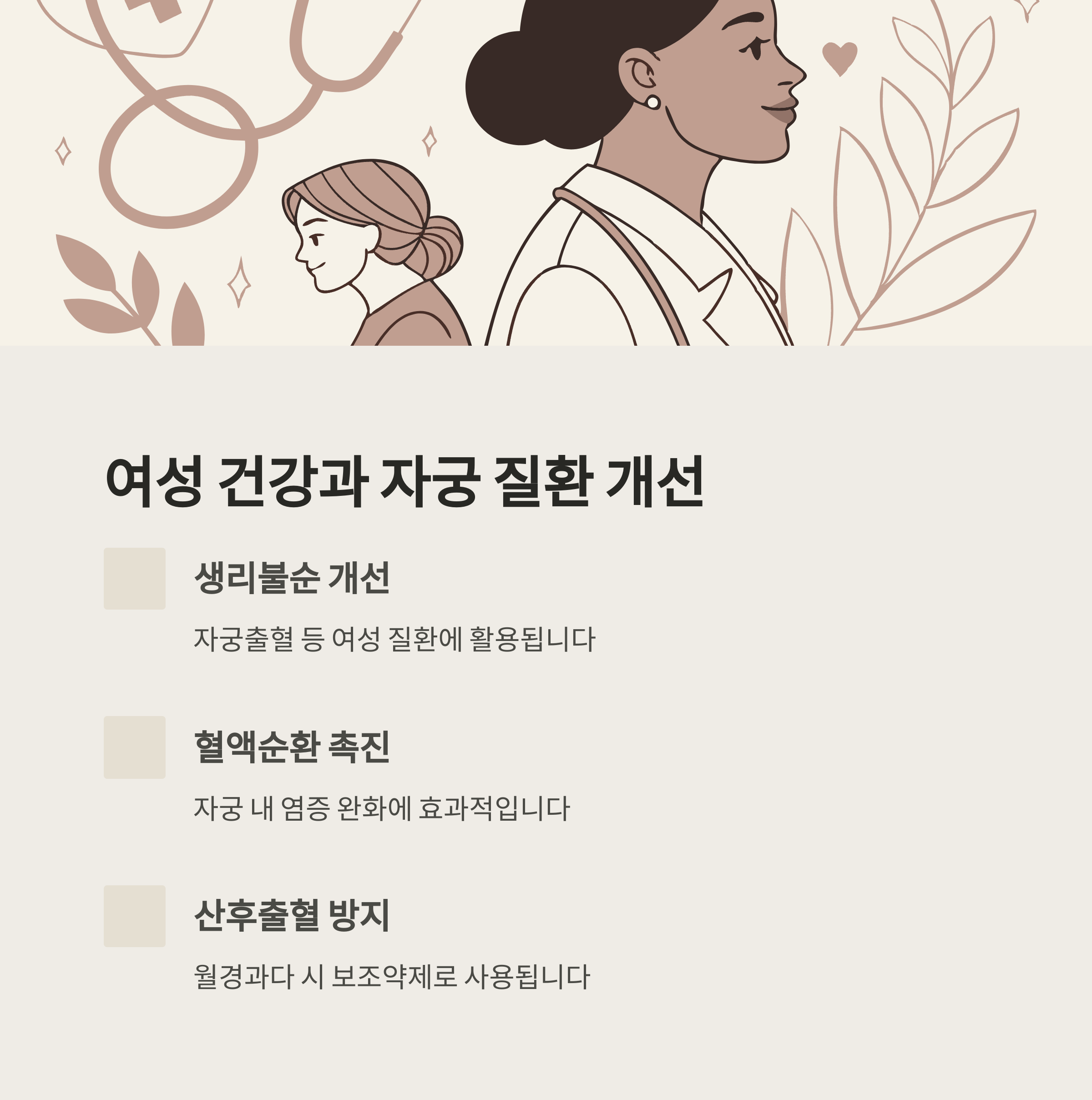 | 여성 건강 | 자궁 염증 완화, 혈액순환 촉진 | 생리불순 개선, 산후출혈 방지 |