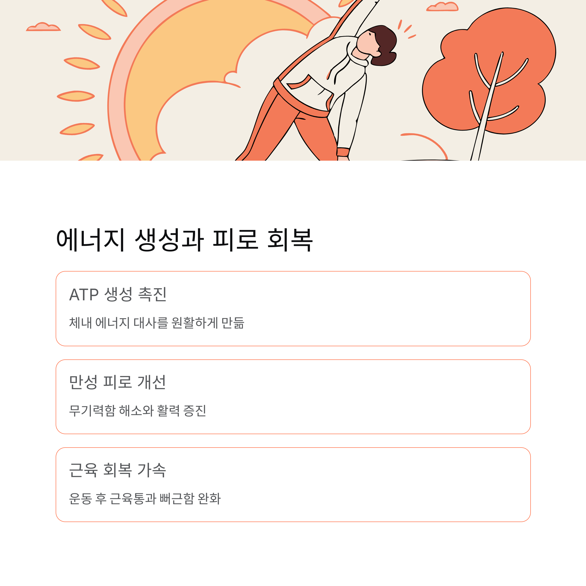 이로 인해 만성 피로, 무기력함을 개선하고 근육 회복 속도를 높이는 데 효과적입니다.