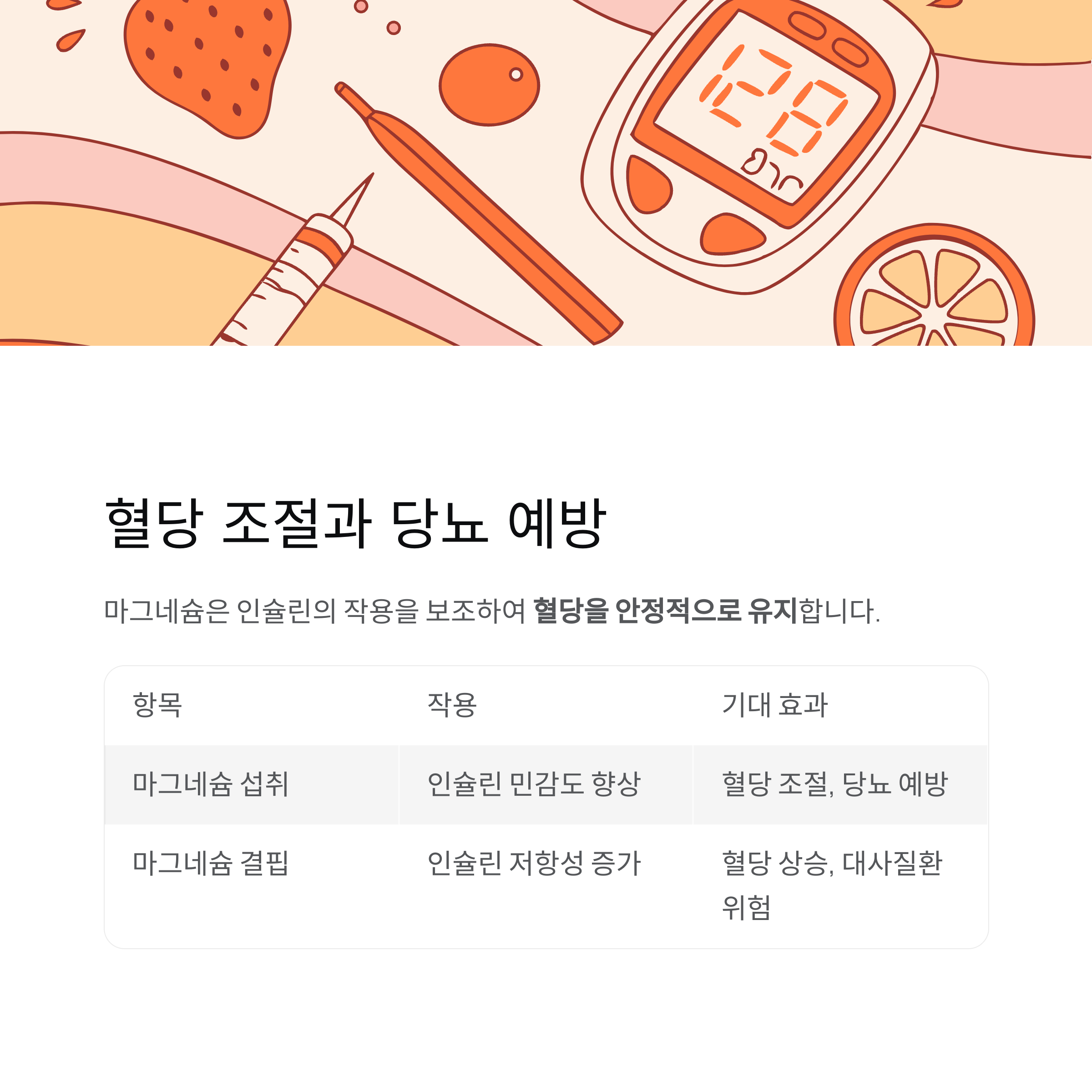 | 마그네슘 결핍 | 인슐린 저항성 증가 | 혈당 상승, 대사질환 위험 |