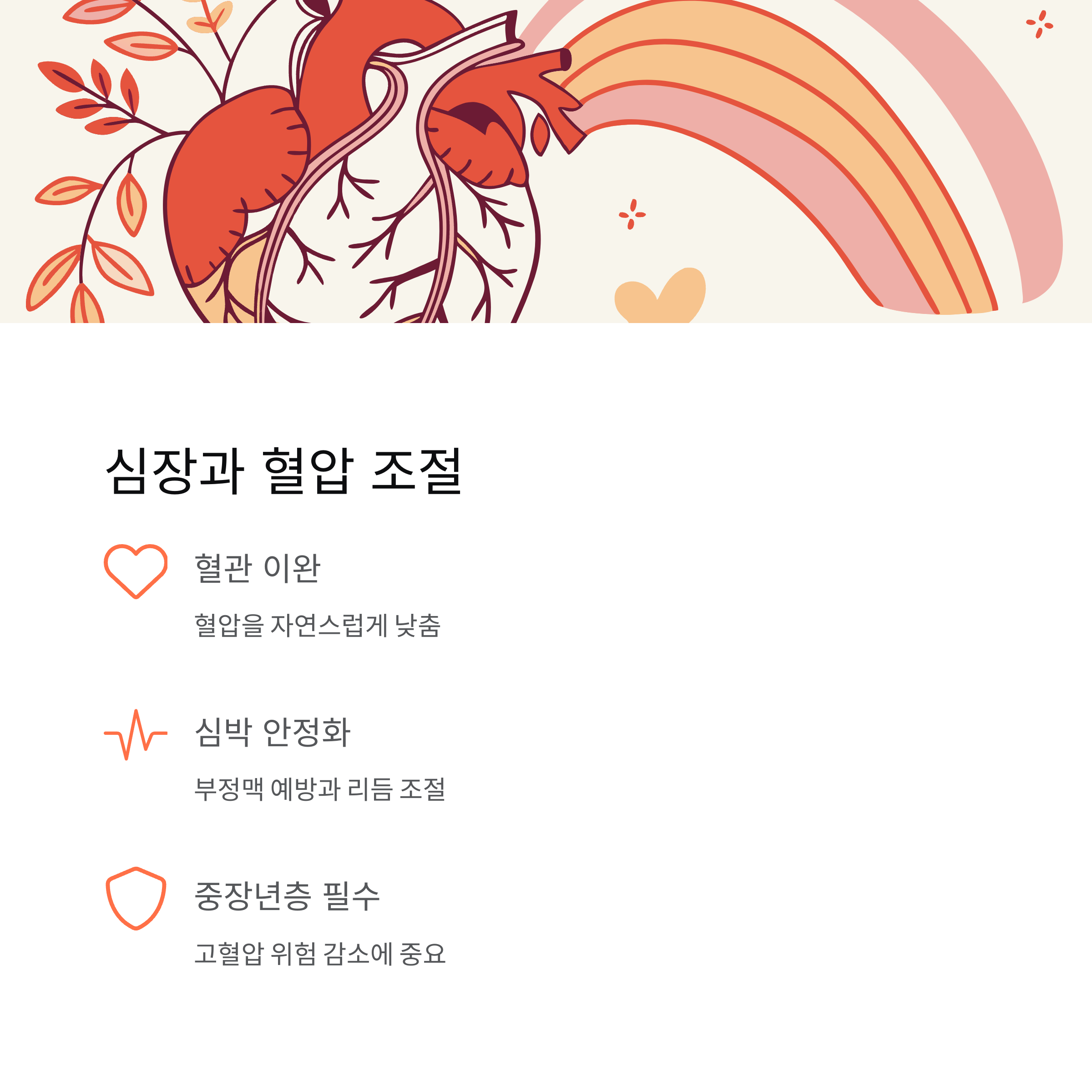 이 미네랄은 혈관 이완을 도와 혈압을 낮추고, 심장 박동의 리듬을 안정화시킵니다.