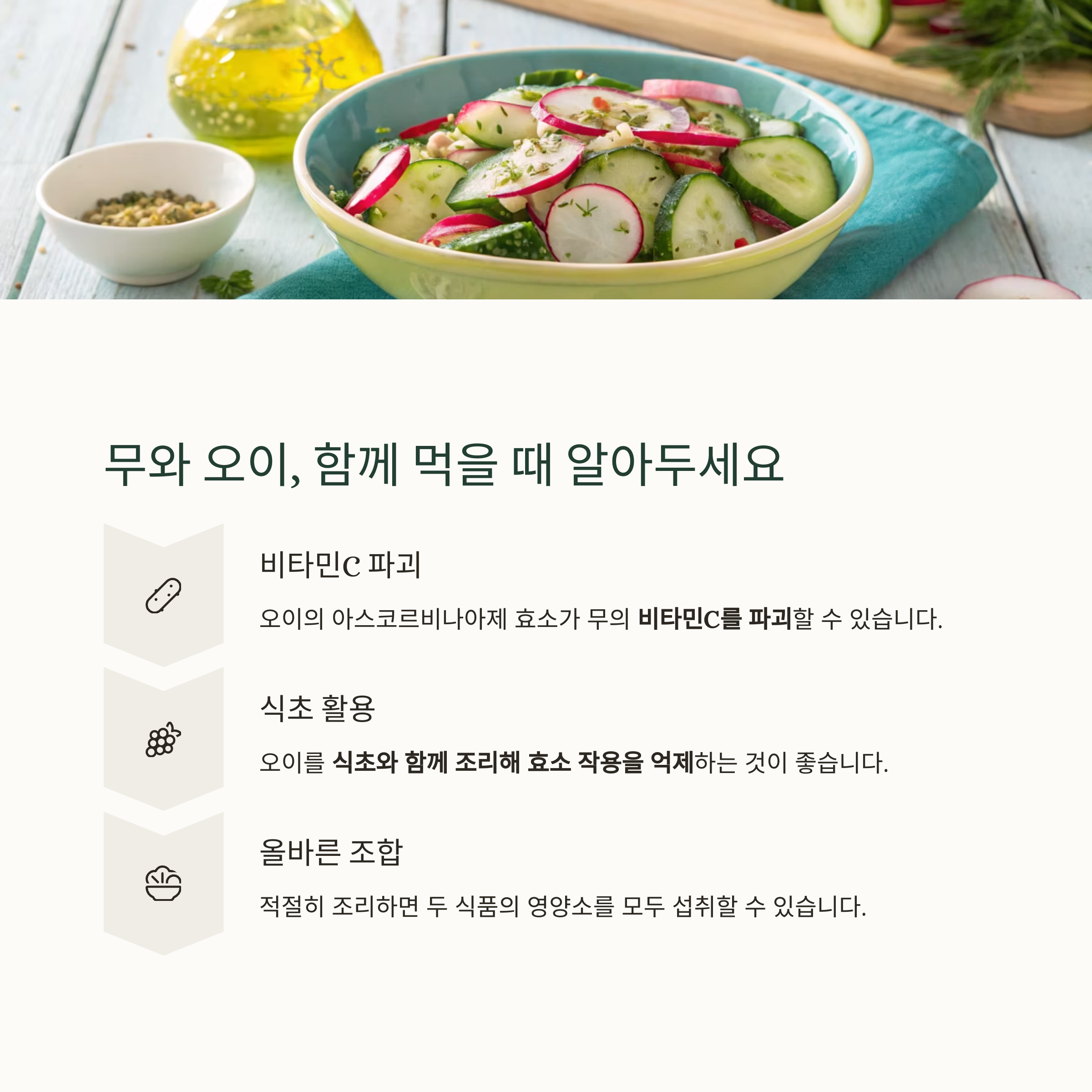 오이에는 아스코르비나아제라는 효소가 있어 무의 비타민C를 파괴할 수 있습니다.
