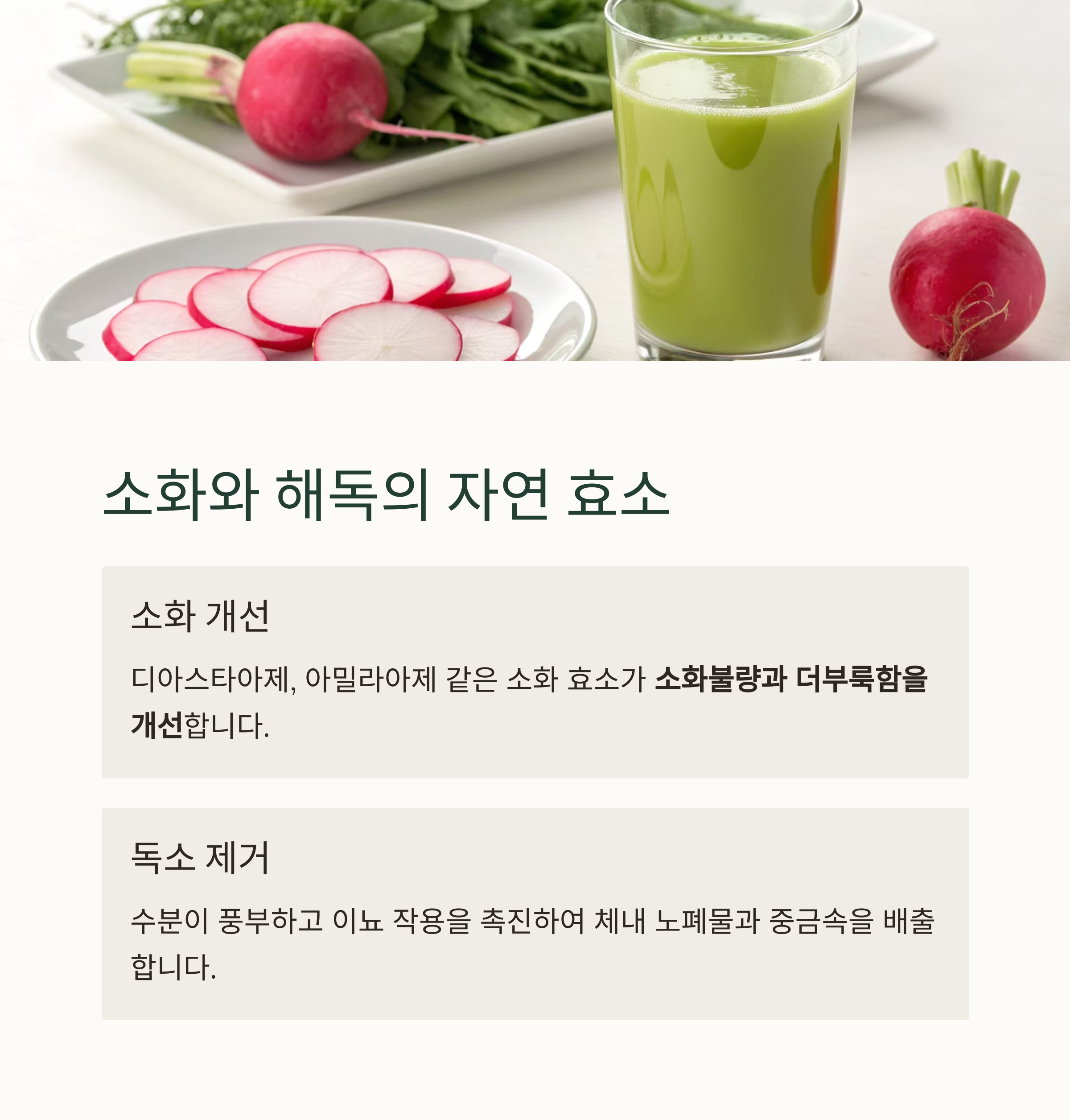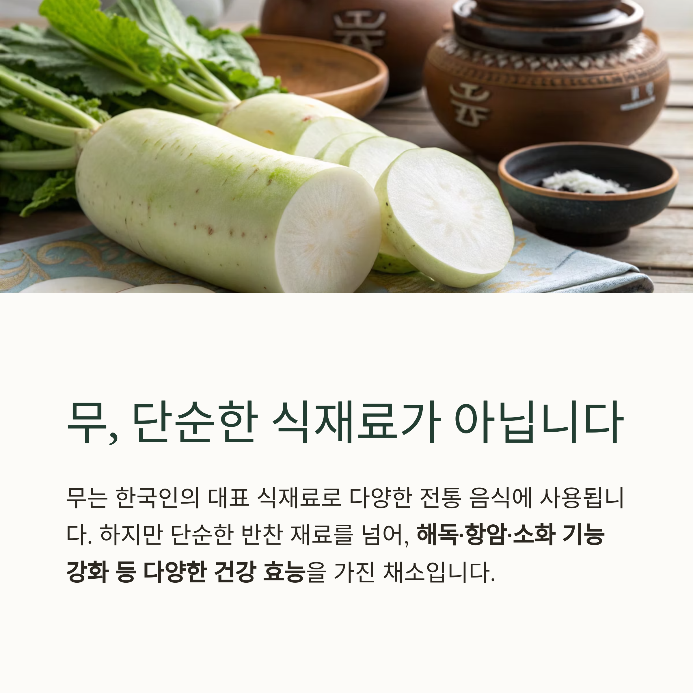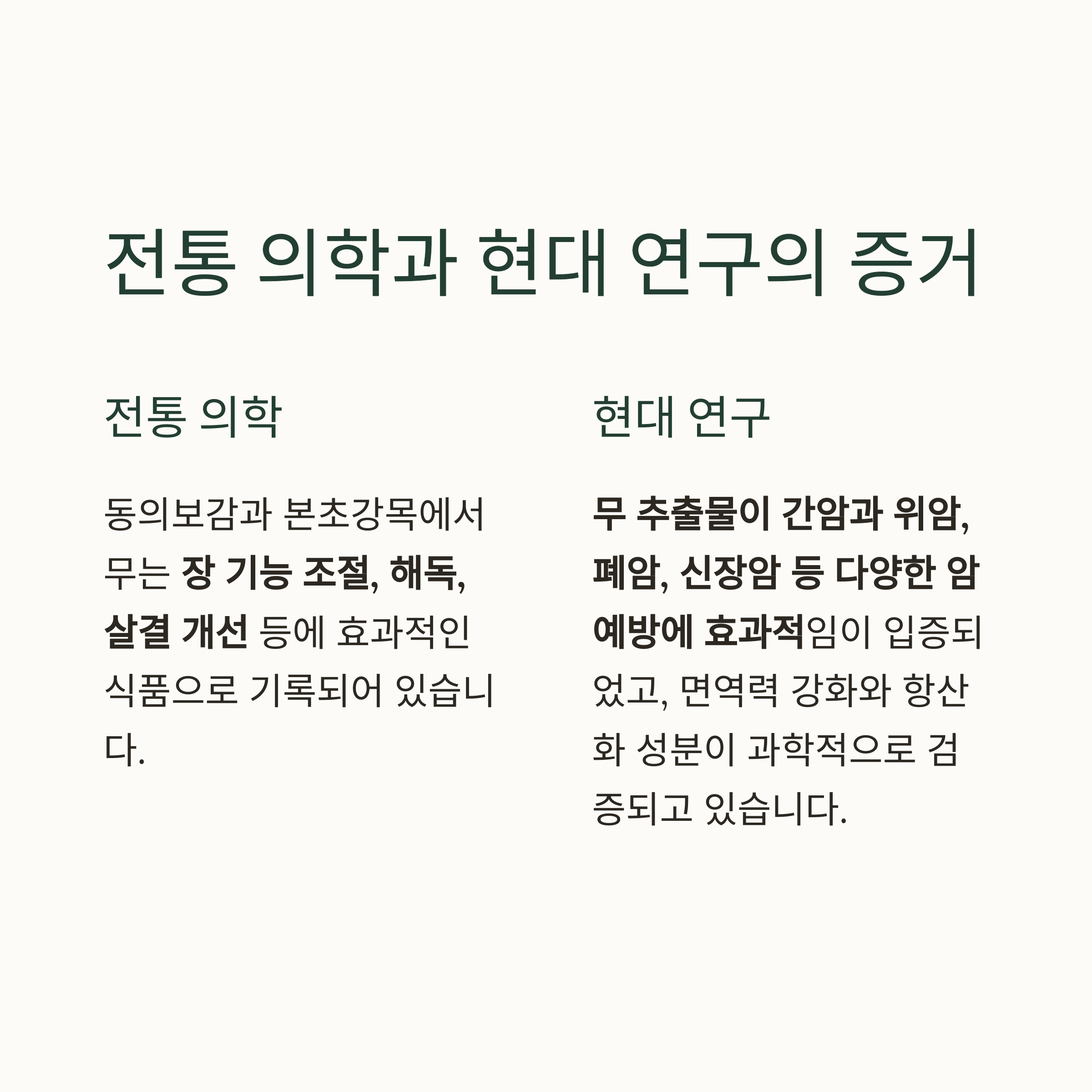 "무는 약이다"라는 말처럼, 동의보감과 본초강목에서도 무는 장 기능 조절, 해독, 살결 개선 등에 효과적인 식품으로 기록되어 있습니다.
