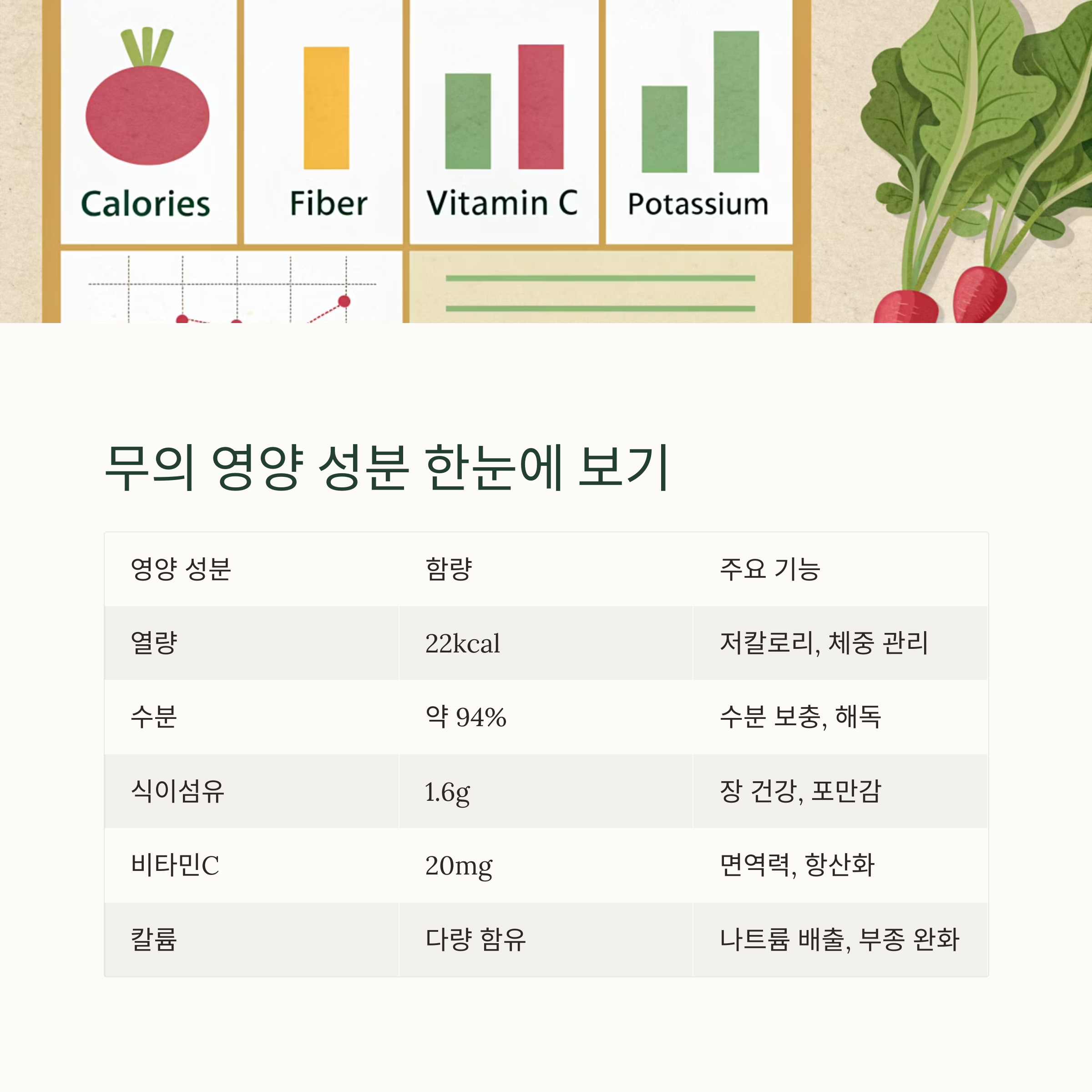 무에는 비타민C, 엽산, 칼륨, 칼슘 등 다양한 미네랄과 항산화 성분이 골고루 포함되어 있습니다.