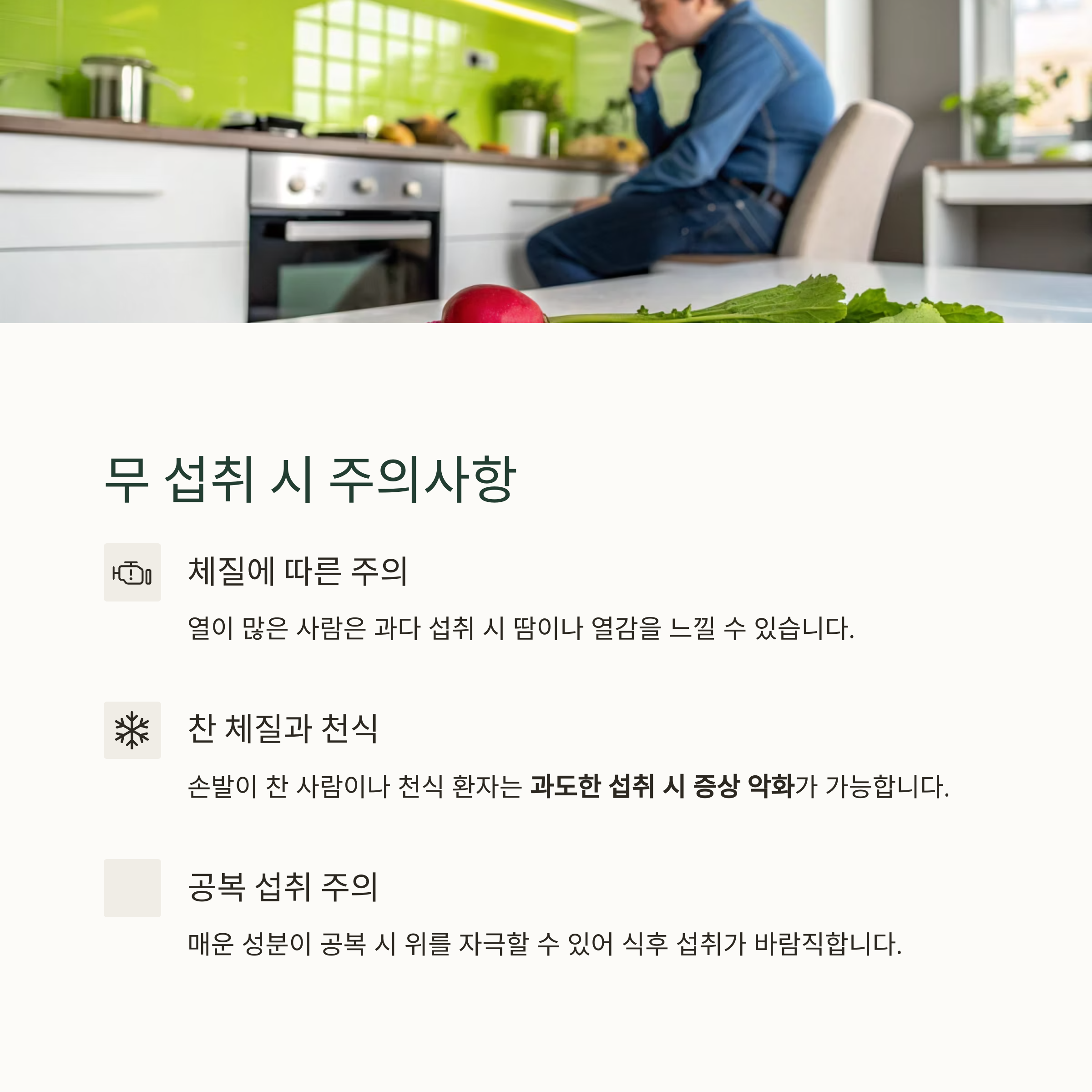 무는 일반적으로 안전한 식품이지만, 특정 체질에는 주의가 필요합니다.