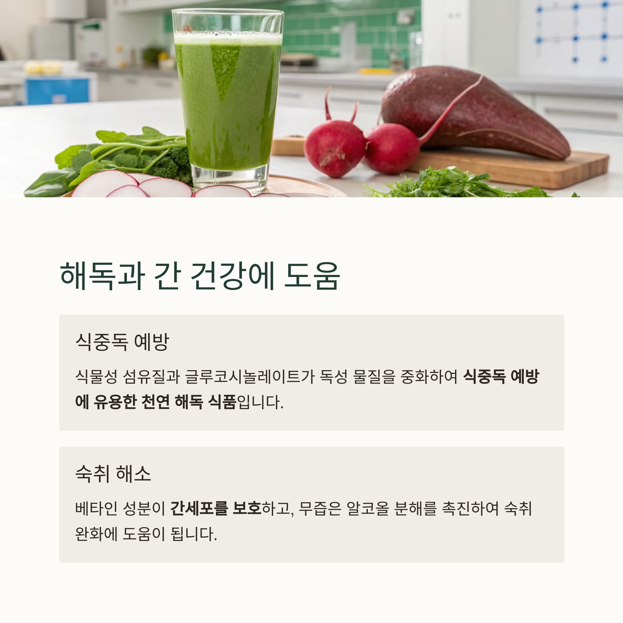 식물성 섬유질과 글루코시놀레이트 등의 성분이 독성 물질 중화에 탁월하며,