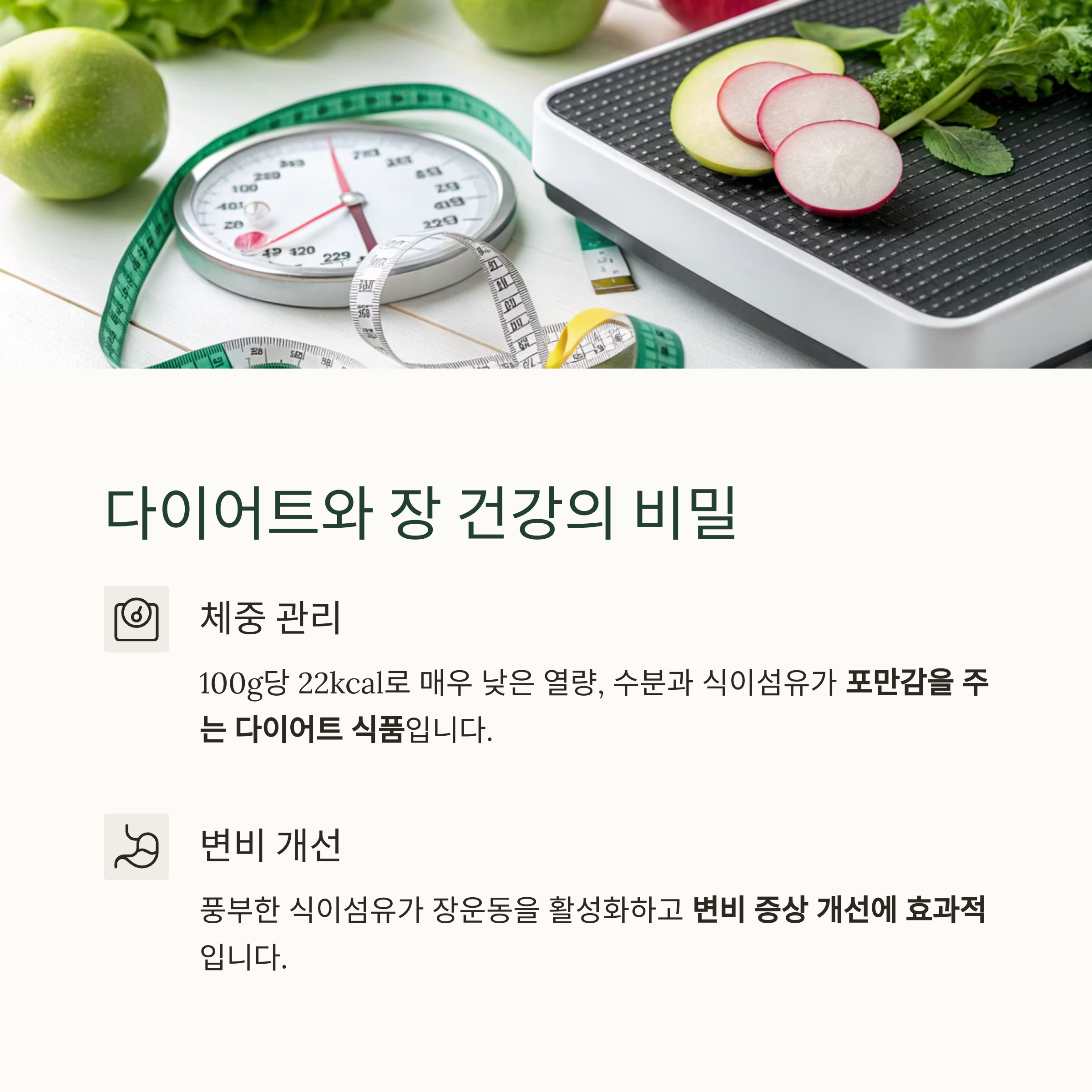 | 열량 | 22kcal | 저칼로리, 체중 관리 |