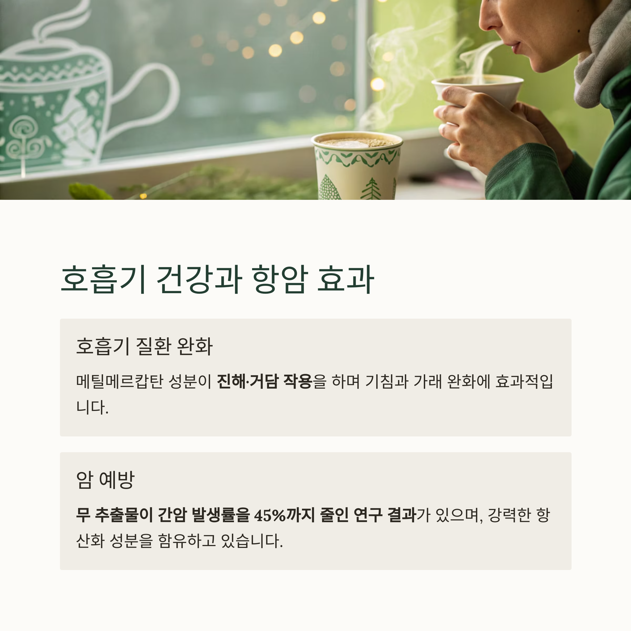 무는 감기나 기관지염 등 호흡기 질환에 유용한 식품입니다.