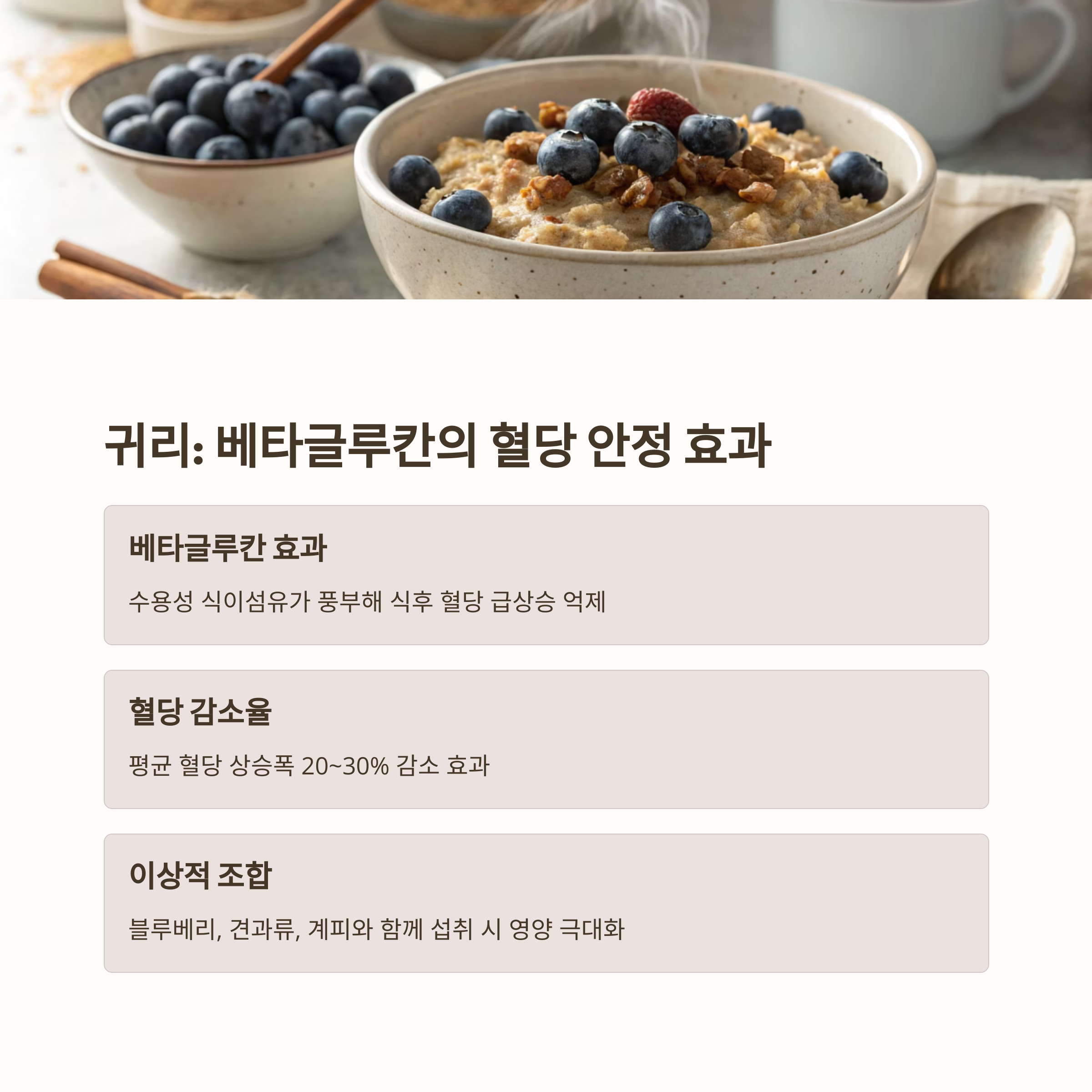 귀리를 아침에 섭취하면 평균 혈당 상승폭이 20~30% 감소한다는 연구 결과가 있습니다